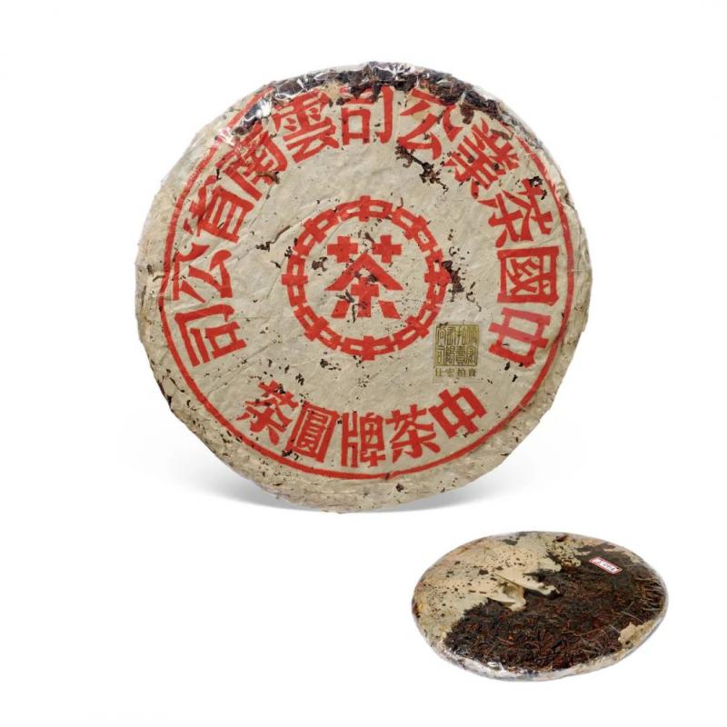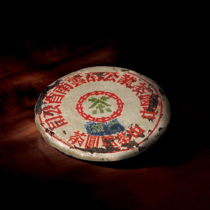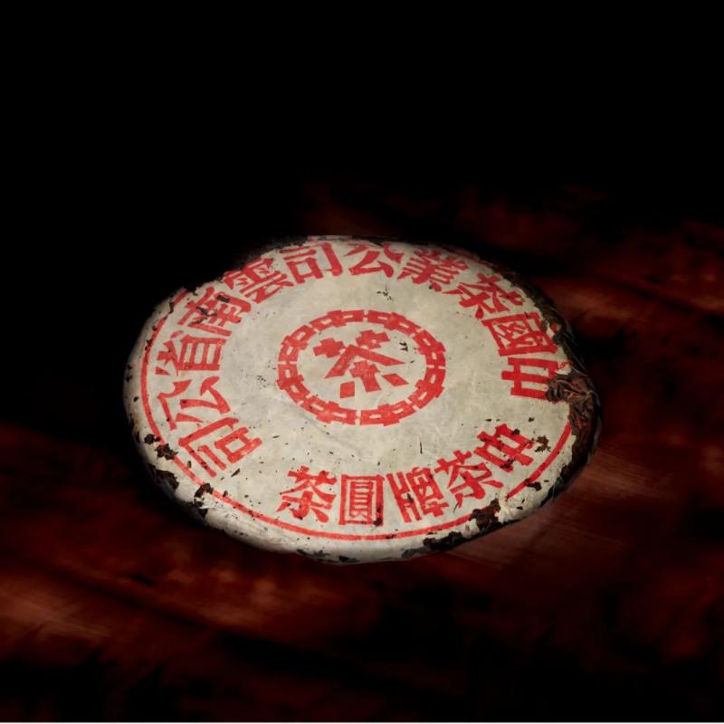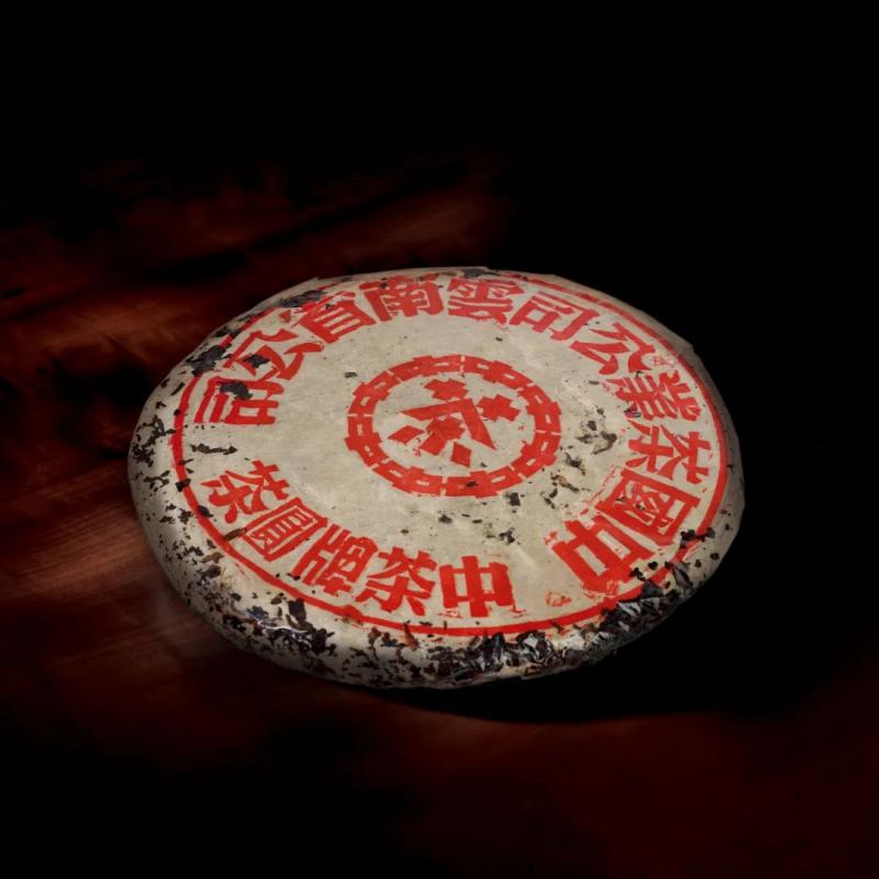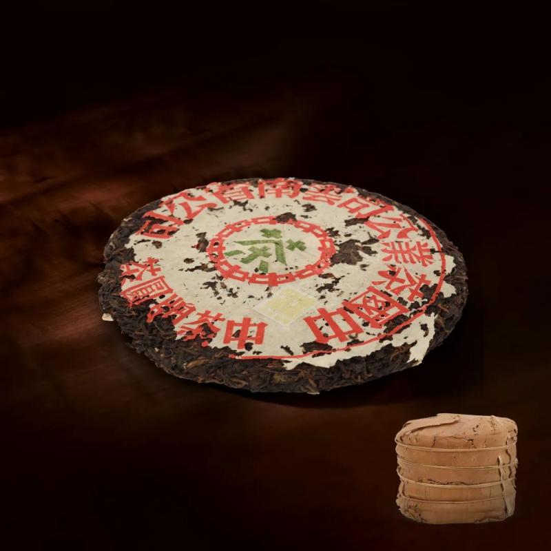 红印铁饼为国营茶厂机械化工艺尝试之产品,经金属模具蒸压,饼身坚硬如铁,胶纸丰富,转化活性持久,是茶史上的独特篇章。其中有一筒七片原包红印铁饼,尤其珍罕难得。