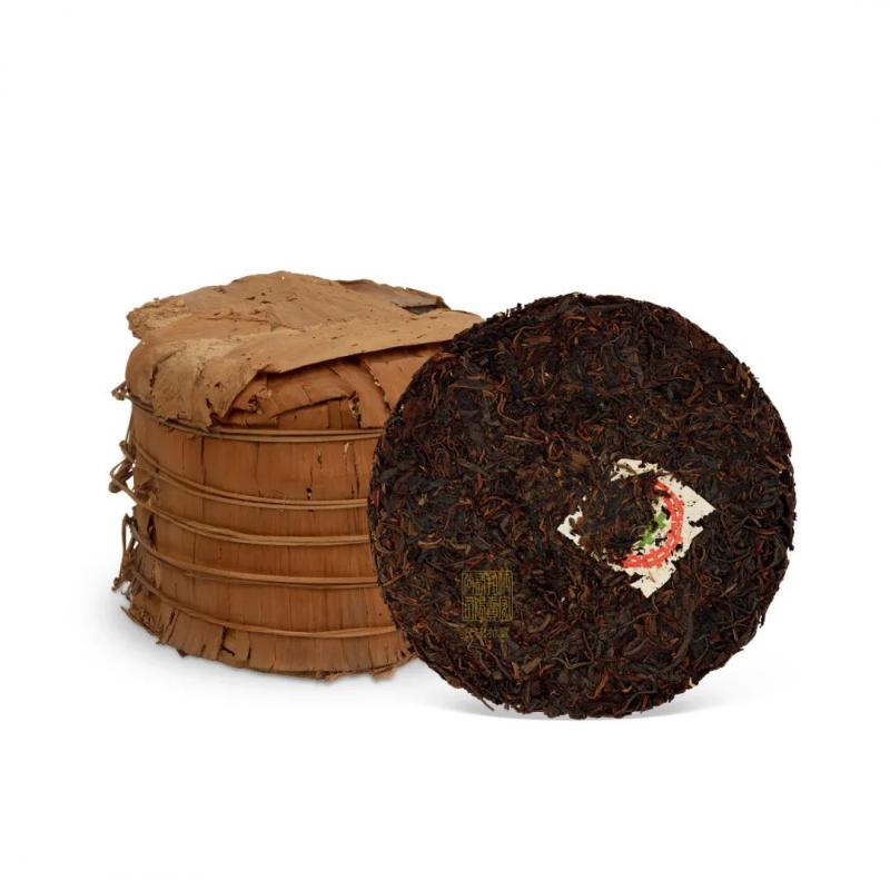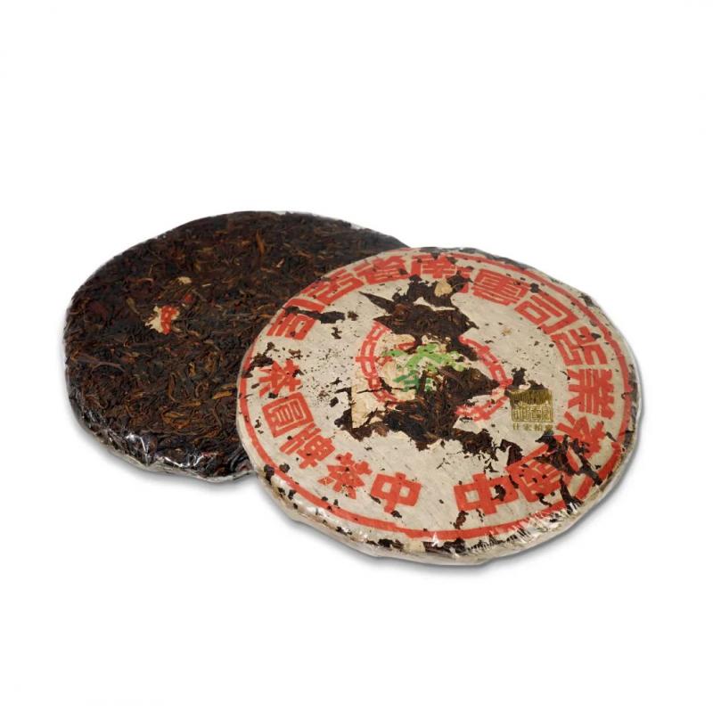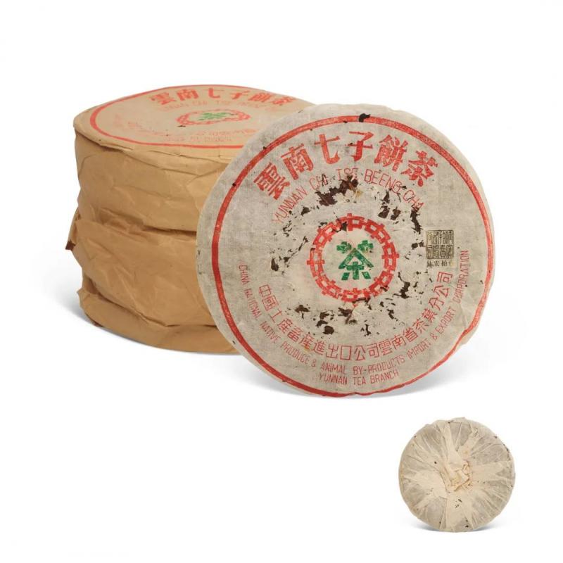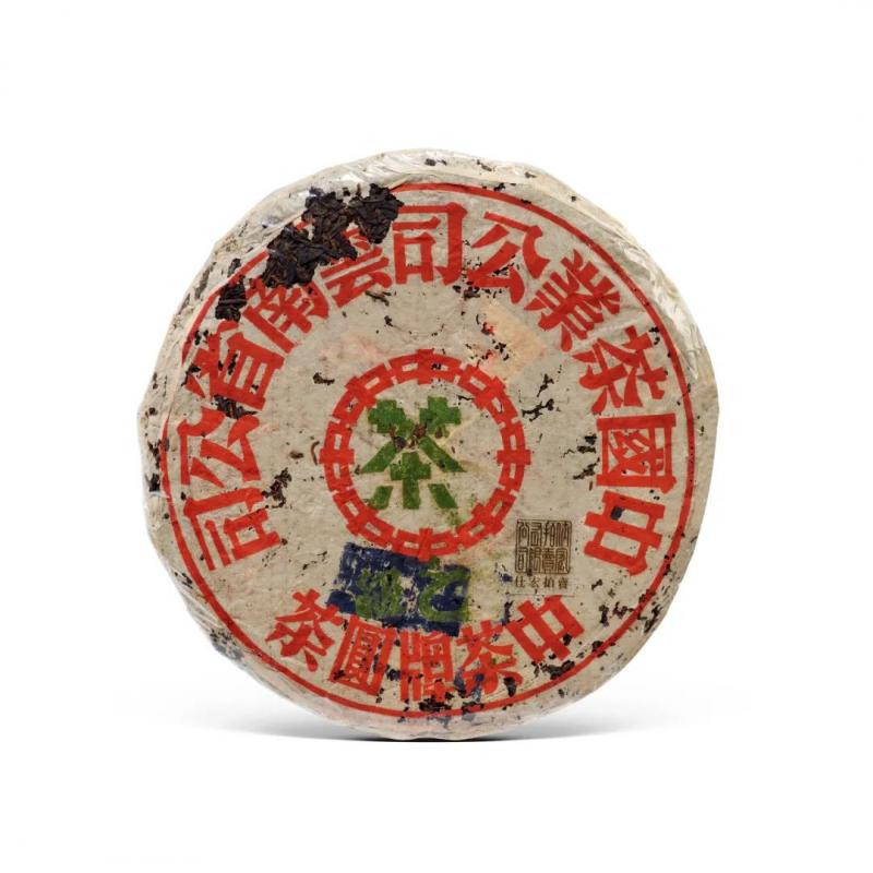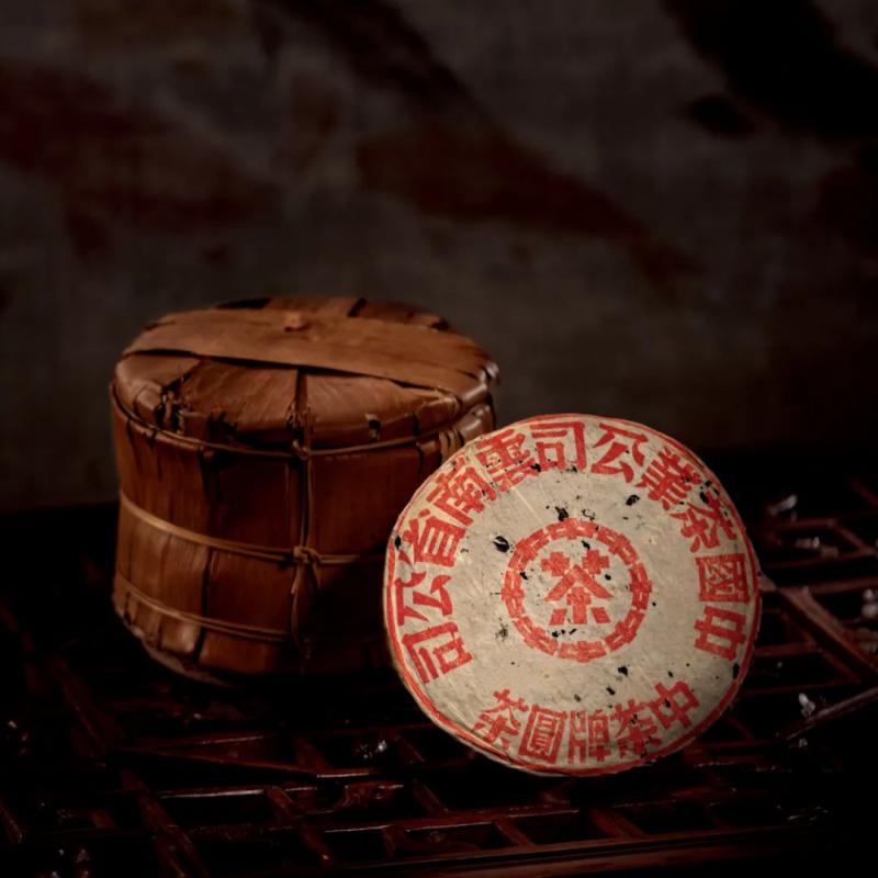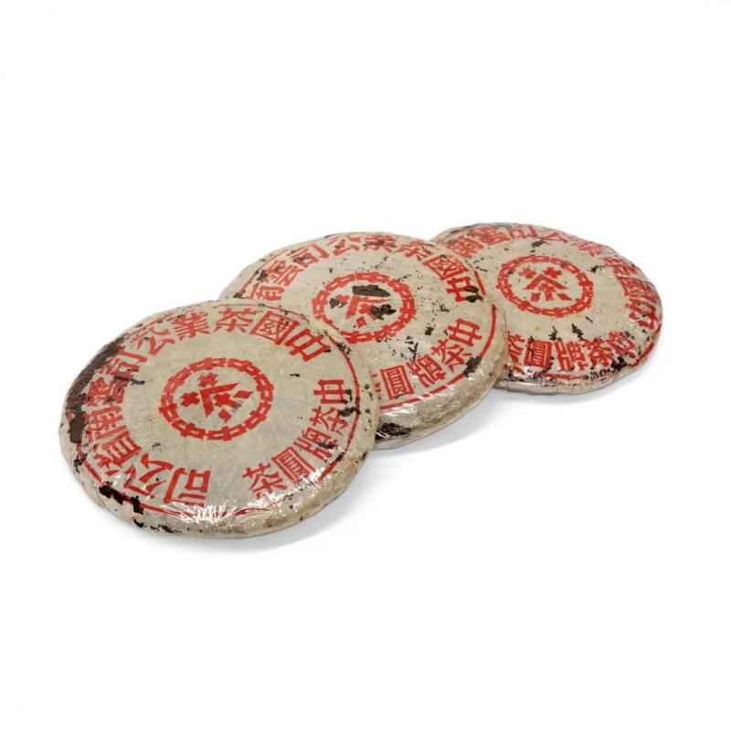 红印铁饼为国营茶厂机械化工艺尝试之产品,经金属模具蒸压,饼身坚硬如铁,胶纸丰富,转化活性持久,是茶史上的独特篇章。其中有一筒七片原包红印铁饼,尤其珍罕难得。