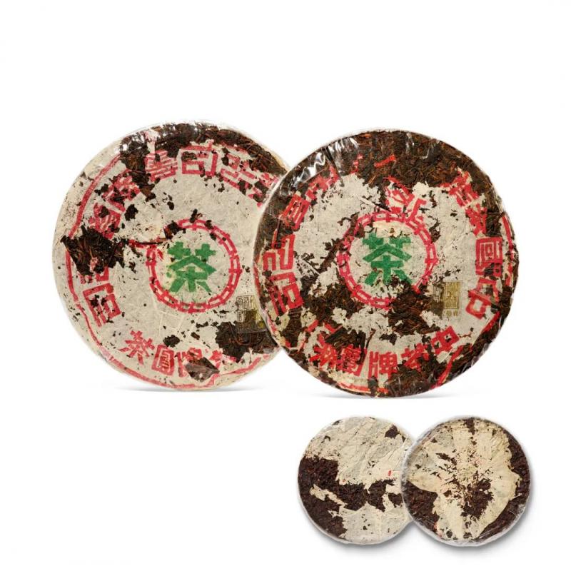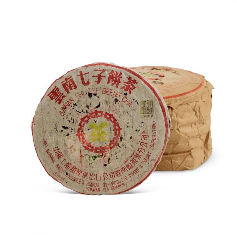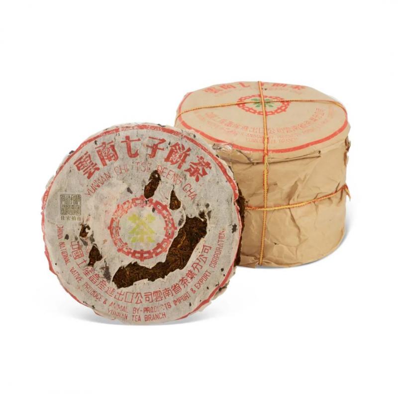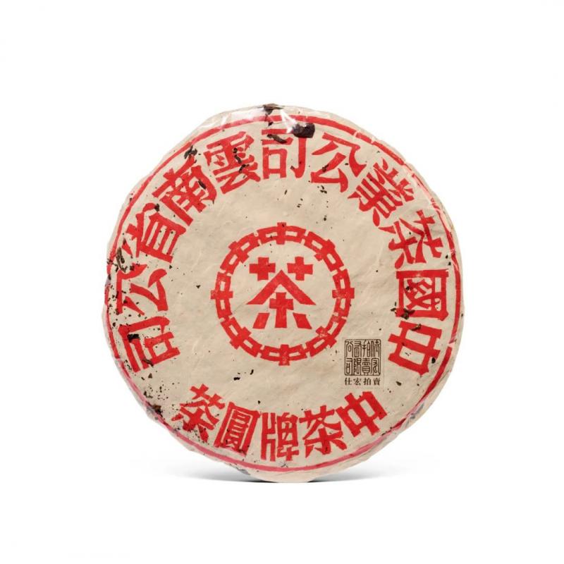 黄印圆茶为勐海茶厂六十年研发,号称「现代拼配茶菁的普洱茶品始祖」。此次拍品中有六十年代原牛皮纸包装八中黄印青饼,一组七片,八中一茶内飞,硬饼黄芽,胶质明显,配茶风格与红印相近,茶面配芽较重,口感丰富,茶气茶韵足,有「小红印」美誉。又有七十年代原牛皮纸筒小黄印青饼,饼模较小,采用七十年代特色的格纹手以勐海幼叶茶菁拼配压制,饼型圆浑紧緻,茶气刚强,茶韵丰富,为印级茶收藏入门之选。