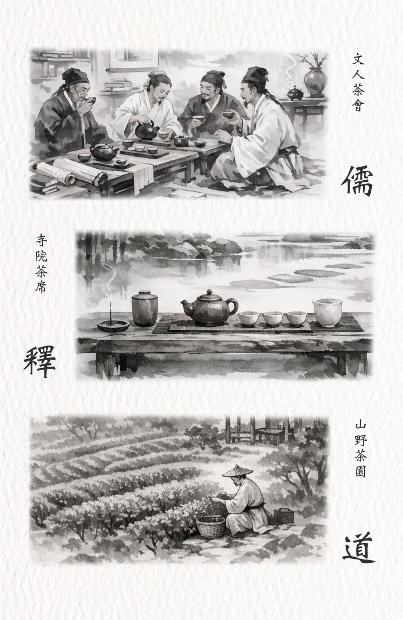 中國古代茶精神,融儒、釋、道三家之韻。 陸羽為其注入儒家的筋骨,他說“精行儉德之人”最宜飲茶。 於是,喝茶成了修行,茶席成了道場; 宋時崇尚儉清和靜之風,文人雅士們點茶、鬥茶,把禪宗的空靈與儒家的和睦,都點化進了那盞雪白的沫餑裏; 而茶生於野,藏於山,老於歲月,一切都順其自然,恰似普洱茶“越陳越香”,也在冥冥中暗合了道家無為而治的哲思。 這份深厚底蘊,為後世的茶文化發展奠定了廣博而開放的基石。