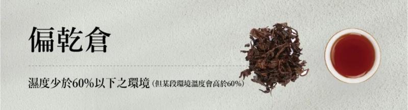 偏乾倉一般儲存於溫度少於60%以下之環境(但某段環境溫度會高於60%),湯色金黃清澈,香純正、回甘快、口感醇厚。