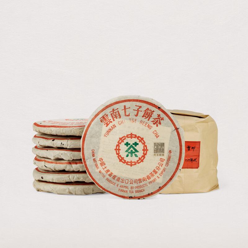 乾倉儲存,品相完美,陳韻表現上佳,市場甚為追捧。厚紙8582青餅最初由香港南天公司向勐海茶廠訂製,堪稱中期茶中的精品。此茶採用五至八級粗壯新老茶菁拼配緊壓。猶以七、八級為主。正是這些經歷了 數十年轉化的粗壯老料,為8582青餅帶來了無盡的回甜與豐 富的層次,令其成為陳茶史上知名度最廣的茶品之一。
