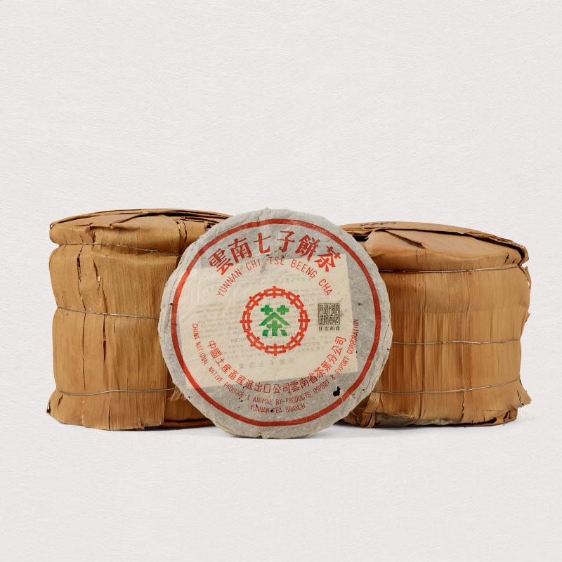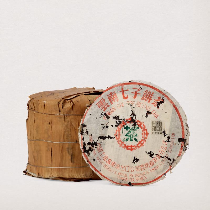 偏乾倉儲,保存良好,採用7532經典配方製作,為勐海茶廠出品採細嫩細菁,餅身較小,外包裝紙用小口中厚棉紙,茶字為粉綠色手工蓋印。經四十多年陳化,茶氣剛強層次飽滿,備受茶人青睞。