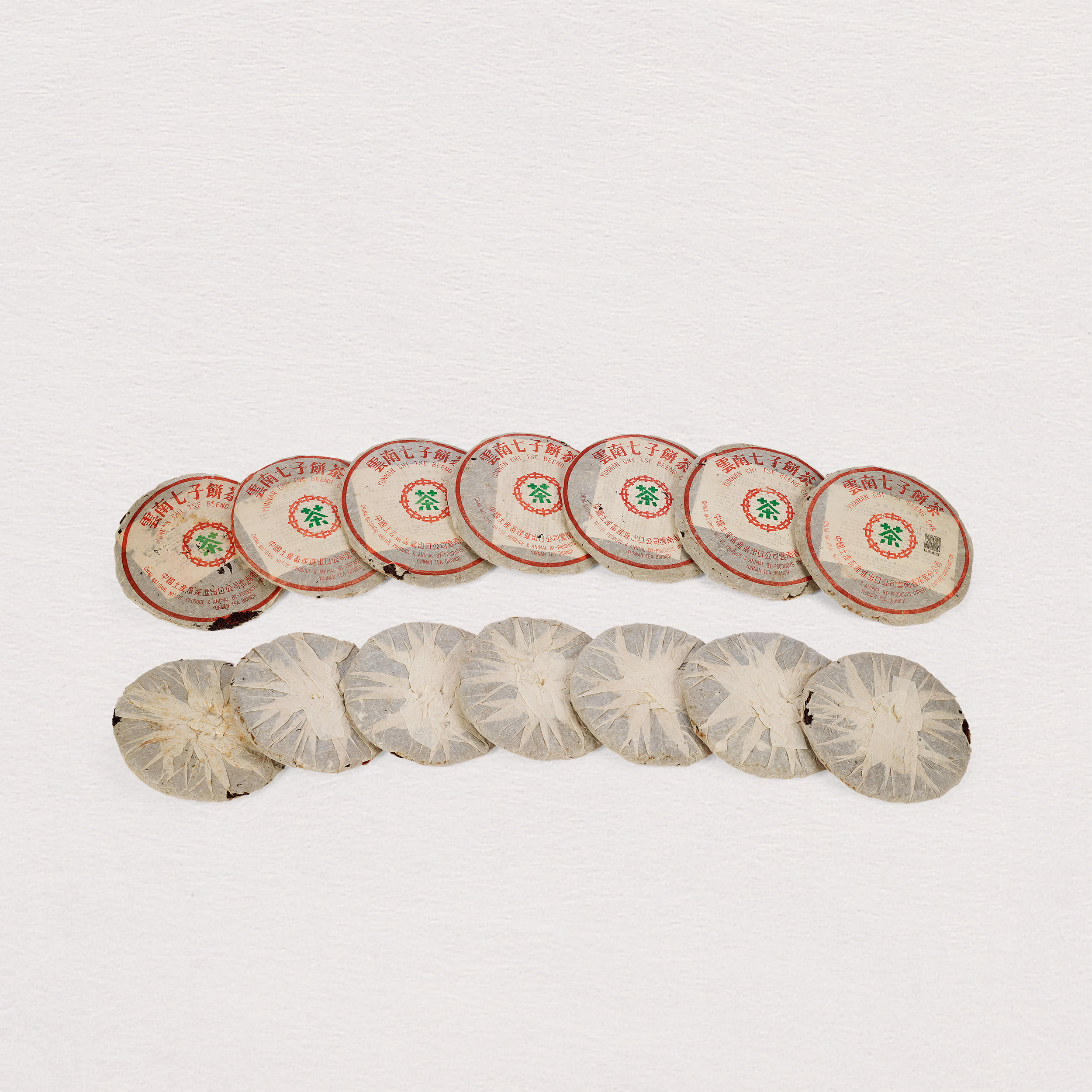 八十年代薄紙8582純乾倉儲一筒共七片。原包,保存完好,條索金黃,茶氣十足,舌面生津。1989年勐海茶廠開始出現薄紙外包,此8582屬1985-1992年間南天貿易公司自行訂制8582配方的茶品,主要是增加粗大原料及茶餅的疏鬆透氣性,以加速陳化。餅面外觀油亮潤澤,條索肥壯,茶湯顏色呈現栗色,回甘生津。拼配以芽尖毛茶為麵茶,粗葉毛茶為底茶。