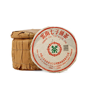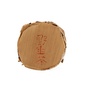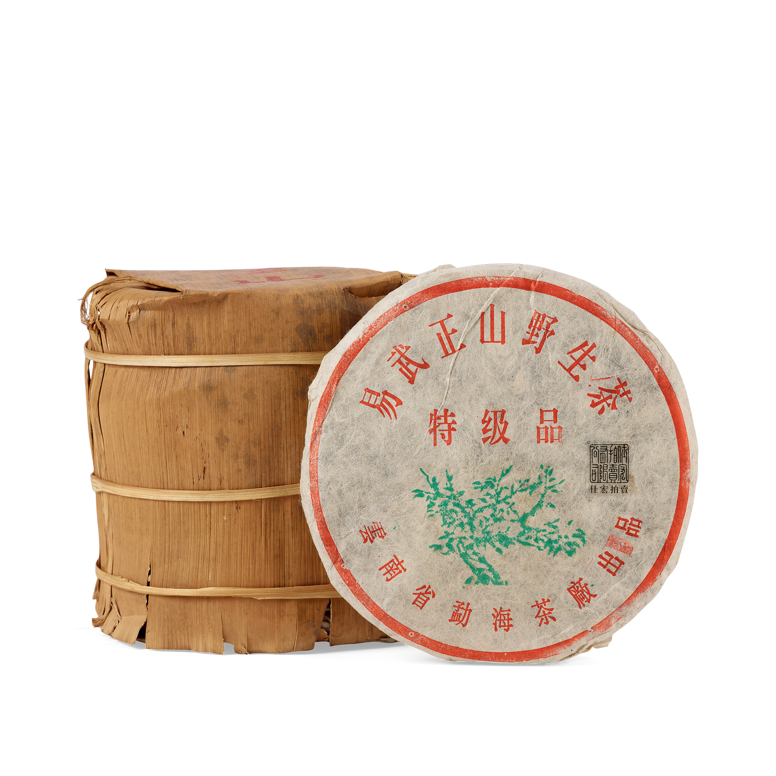 99綠大樹藍黑票青餅,一筒七片,純乾倉儲存,保存完整,為1999年廣州茶商葉炳懷先生以精選三百年以上的易武正山野放喬木春尖茶菁為料,委任勐海茶廠精工壓製而成。茶餅內飛有黑色蓋章,因採用原始木板印刷,版面上殘留許多處紅色的木板痕跡,成為藏家入手的暗記,經二十多年的陳化,茶氣活性十足,後續醇化潛力大,味韻出眾,備受市場追捧。