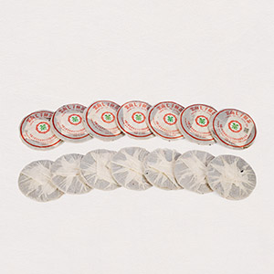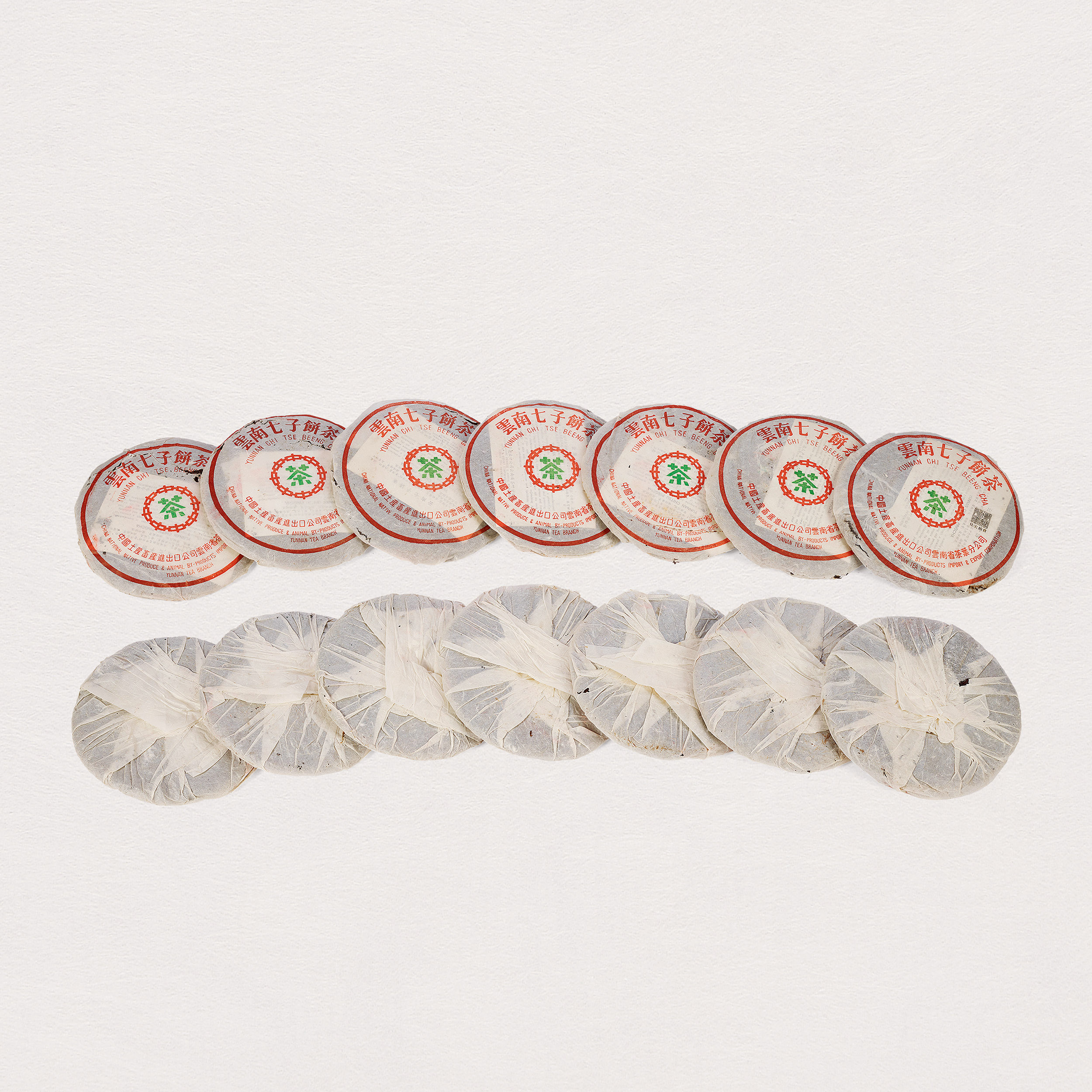 八十年代末標準版88青餅四筒二十八片,乾倉保存,標準版88青蘋果綠大餅頭。88青為勐海茶廠八十年代末以7542配方生產,茶餅以中壯葉為主體,嫩芽鋪面,88青貴為茶商加封及乾倉概念之鼻祖,有經典梅子香韻,質感強勁厚重,生津回甘快。88青餅生產年份橫跨數年,茶菁更是勐海茶廠存放多年的老茶菁,茶底優越,陳化風味獨特,變化豐富,備受熱捧。