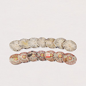 七十年代初小黃印青餅,自然倉儲,外包紙稍有破損,其中一片見香港老茶莊商標。茶面毫頭較多,陳化後茶麵茶芽已醇化為深金黃色。餅面條索級數高,偶有一些茶芽與茶骨拼入,豐富了茶味層次,是拼配茶始祖。因積年累月油墨氧化,綠字漸漸變成了黃字,其餅模比傳統的印級茶小。