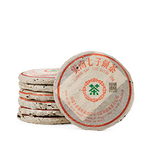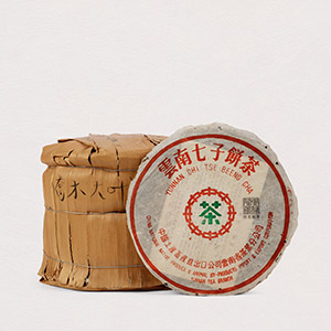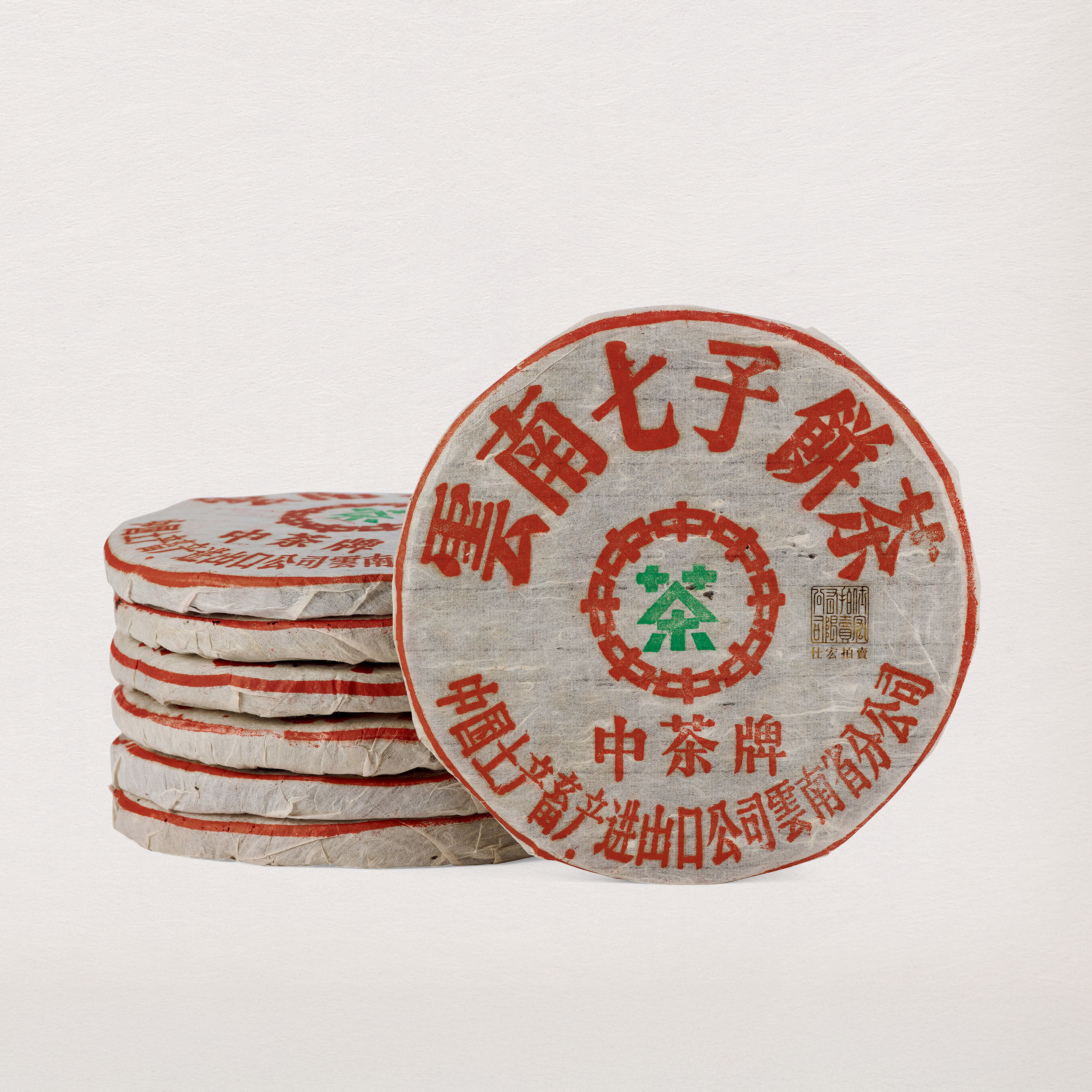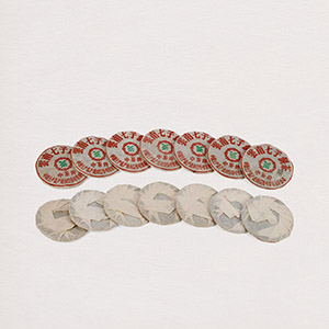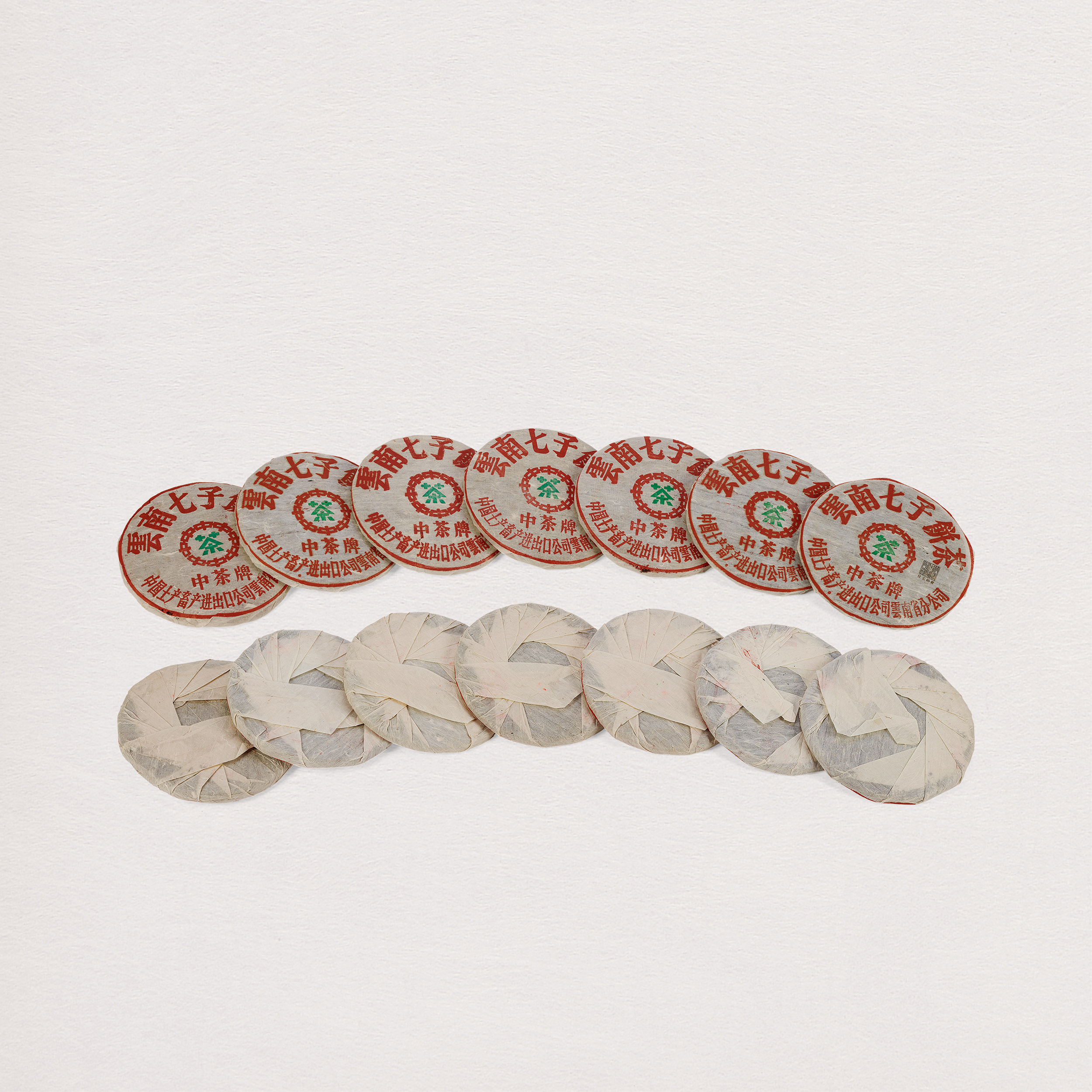 六十年代昆明鐵餅七片,自然倉儲,原包保存完整,承襲了藍印鐵餅的形制,底平無窩,背面乳釘平行直排,餅身緊實,膠質豐富,口感表現強勁,氣韻足,喉韻持久。其茶湯口感較傳統餅型濃厚,是帶有一定印級茶風格的經典之作,在老生茶中具有很大的性價比。