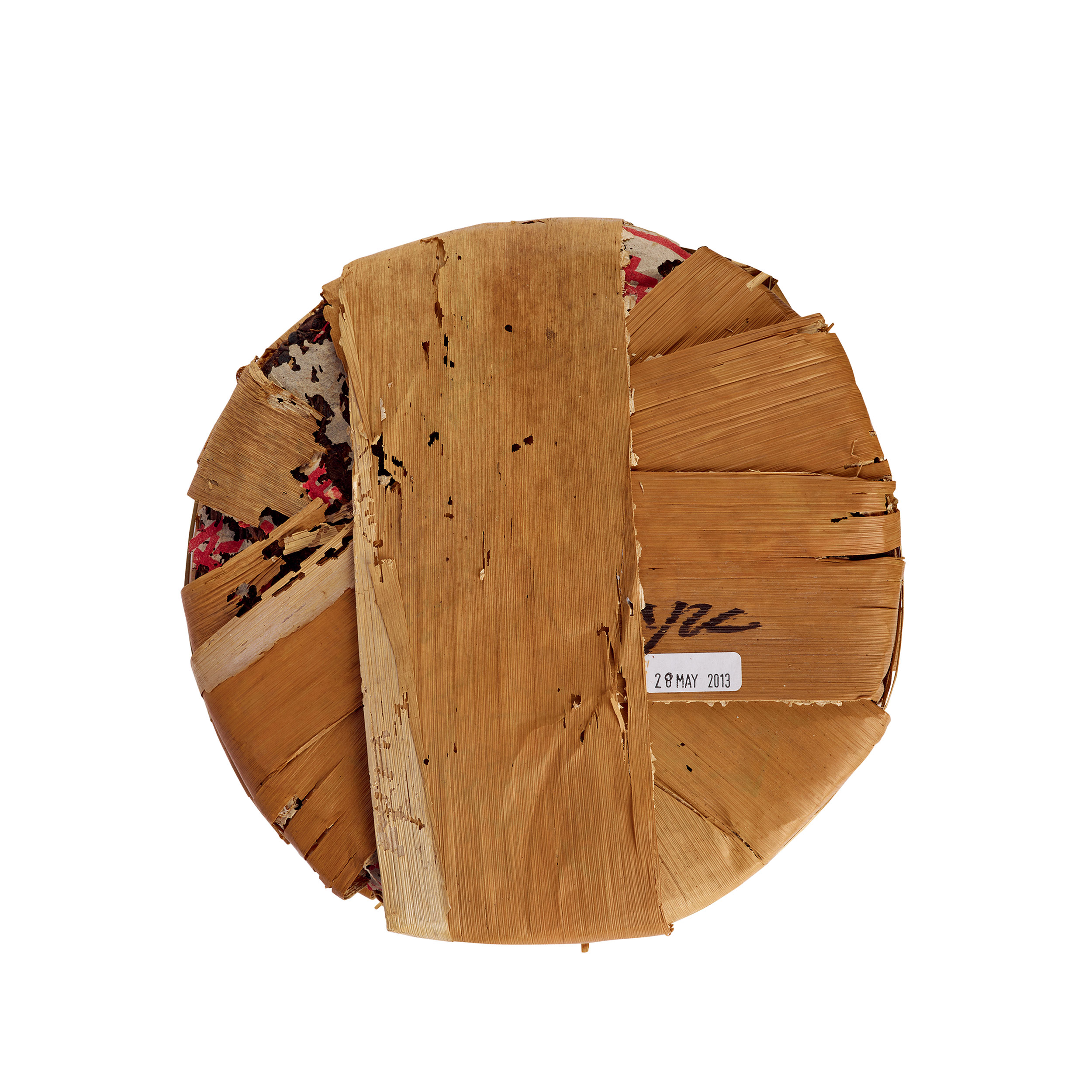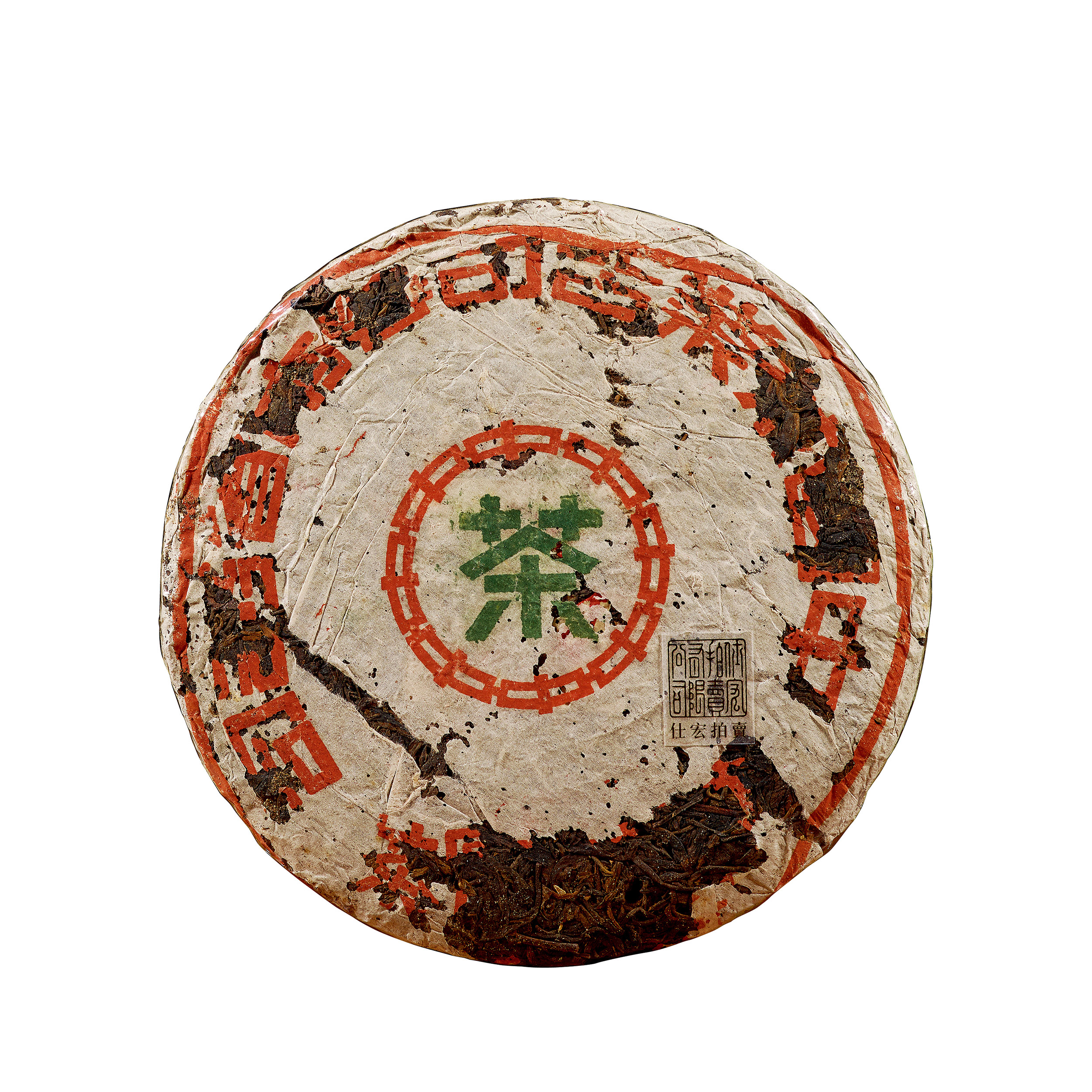 此五十年代藍印鐵餅,原筒七片,乾倉保存,保存完好,原封未拆。惟外包紙稍有破損,乃上世紀五十年代經典代表茶品,葉面金黃,茶氣十足。藍印鐵餅採用易武喬木茶菁為原料,採用當時新研發的製作工藝,取消布袋包揉壓,採用金屬模具直接壓製脫模而成。由於鐵餅緊結密實,新茶膠質更易提早釋放出來,使豐富的茶膠勻齊地分佈在茶葉表層,光澤鮮明。茶餅緊實和低濕度的乾倉環境,後續發酵轉變緩慢,經七十年的陳化,茶湯的口感較傳統餅形更為強烈,氣韻十足且充滿活性,回甘強勁,已逐漸達到最佳品飲時機。