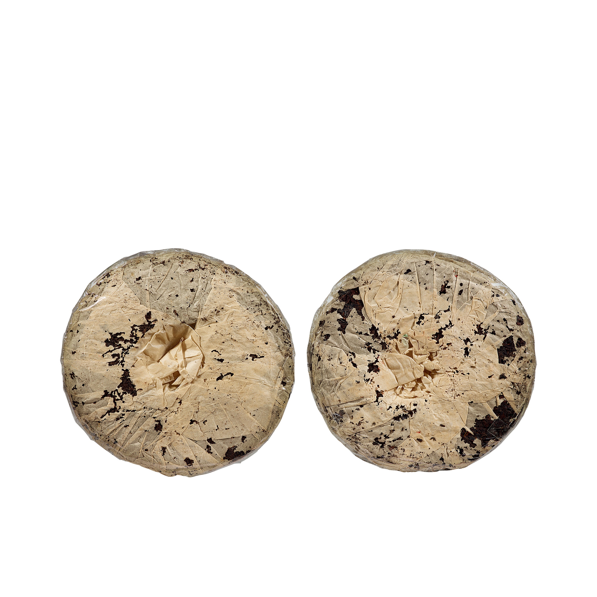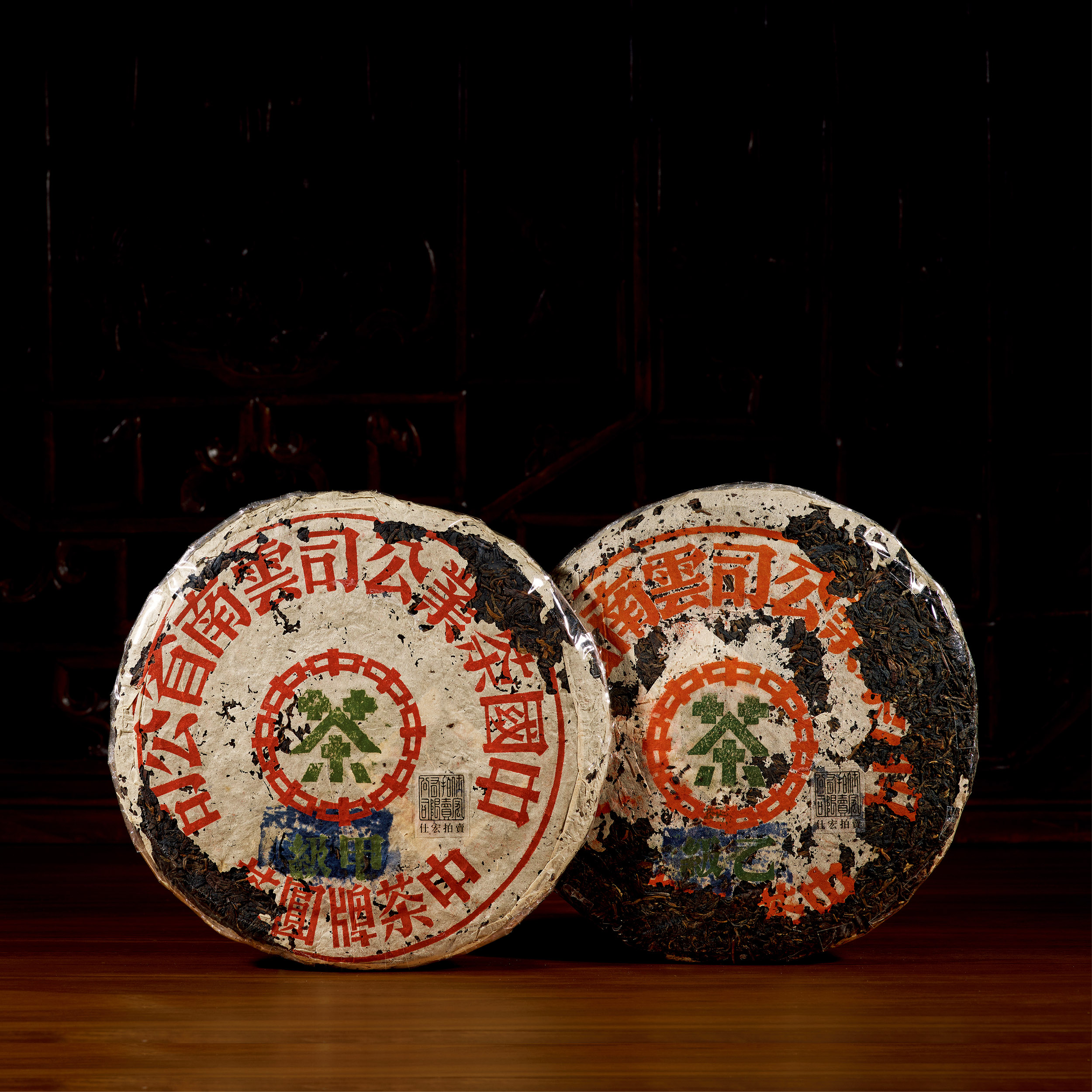 五十年代甲級﹑乙級藍印青餅各一片,原包保存,乾倉儲存,外包裝稍有破損,分別為手工厚纖維紙硃紅版及手工薄棉紙桃紅版,茶面條索分明,餅面分別印有甲、乙級字樣,紅印同期出品,精選勐海區上好老樹喬木茶菁,包括思茅至巴達山及南糯山一帶(南糯山乃最老的栽培型茶樹之王),以傳統工藝輔以上乘老樹茶菁為料,配茶萌芽重,茶韻富層次,整體出品更穩定一致,經七十多年良好環境陳放,陳韻、樟香、茶氣益增。