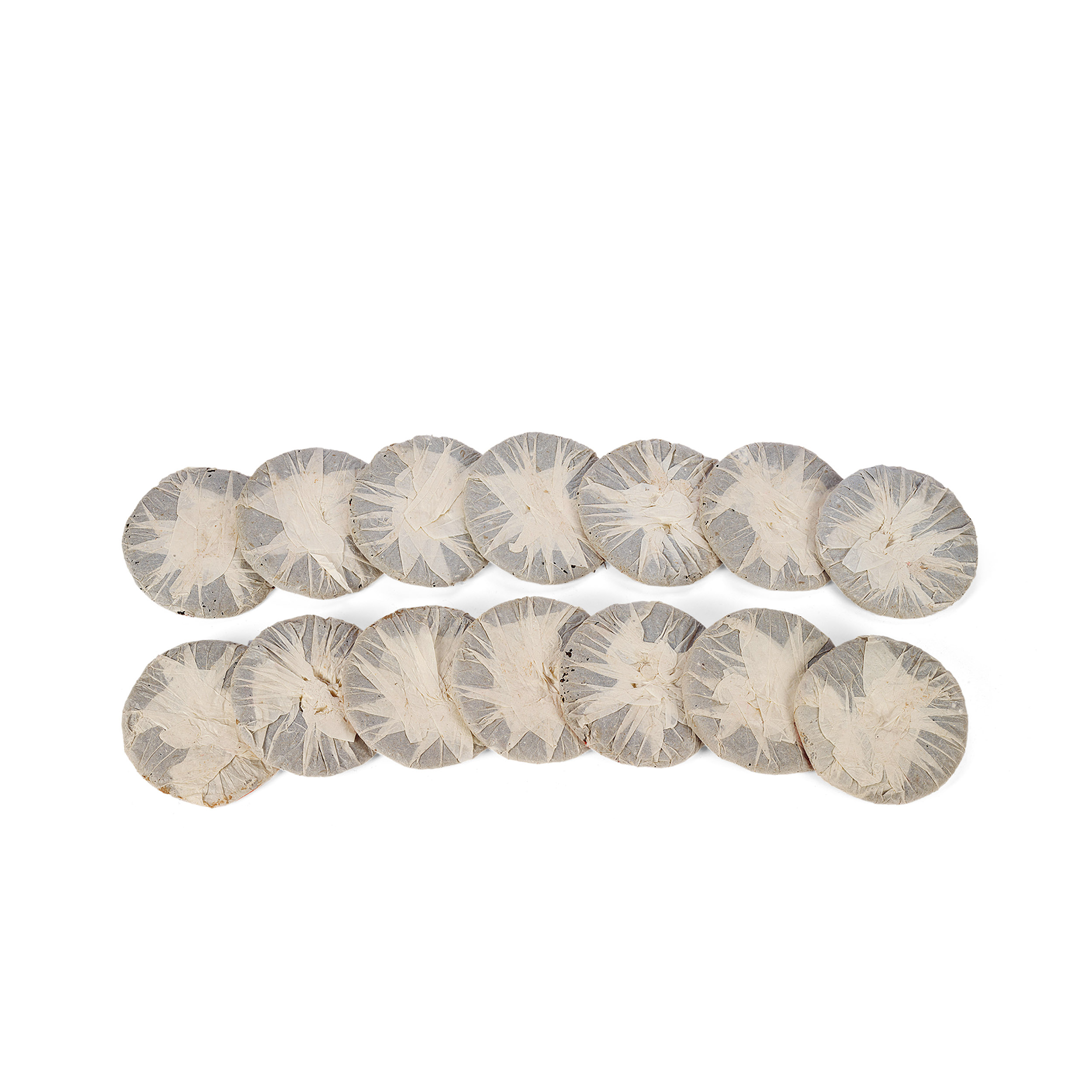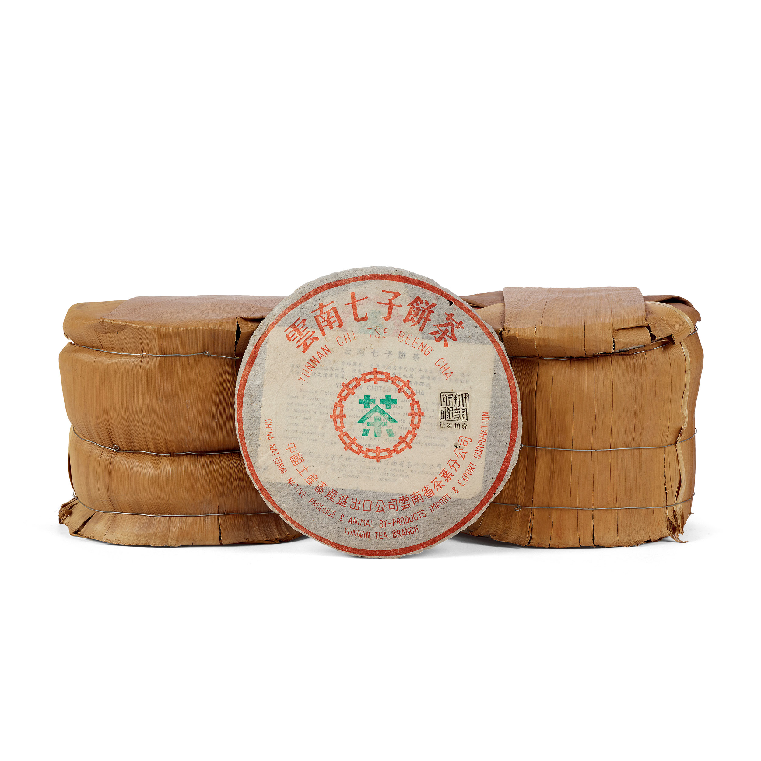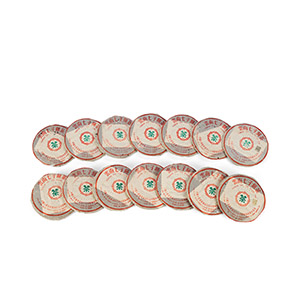 八十年代末88青同期7542青餅兩筒共十四片,偏乾倉儲,薄絲紋棉紙,一點雲,保存完好,幾沒破損。7542是勐海茶廠20世紀1975年代研發的經典配方,是勐海茶廠八十年代的標杆茶品。四十餘年良好環境陳化,茶性剛強,韻味飽滿層次豐富。