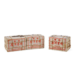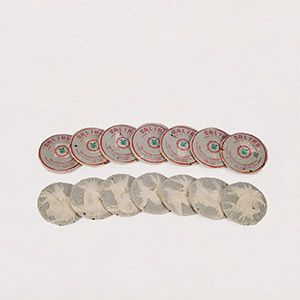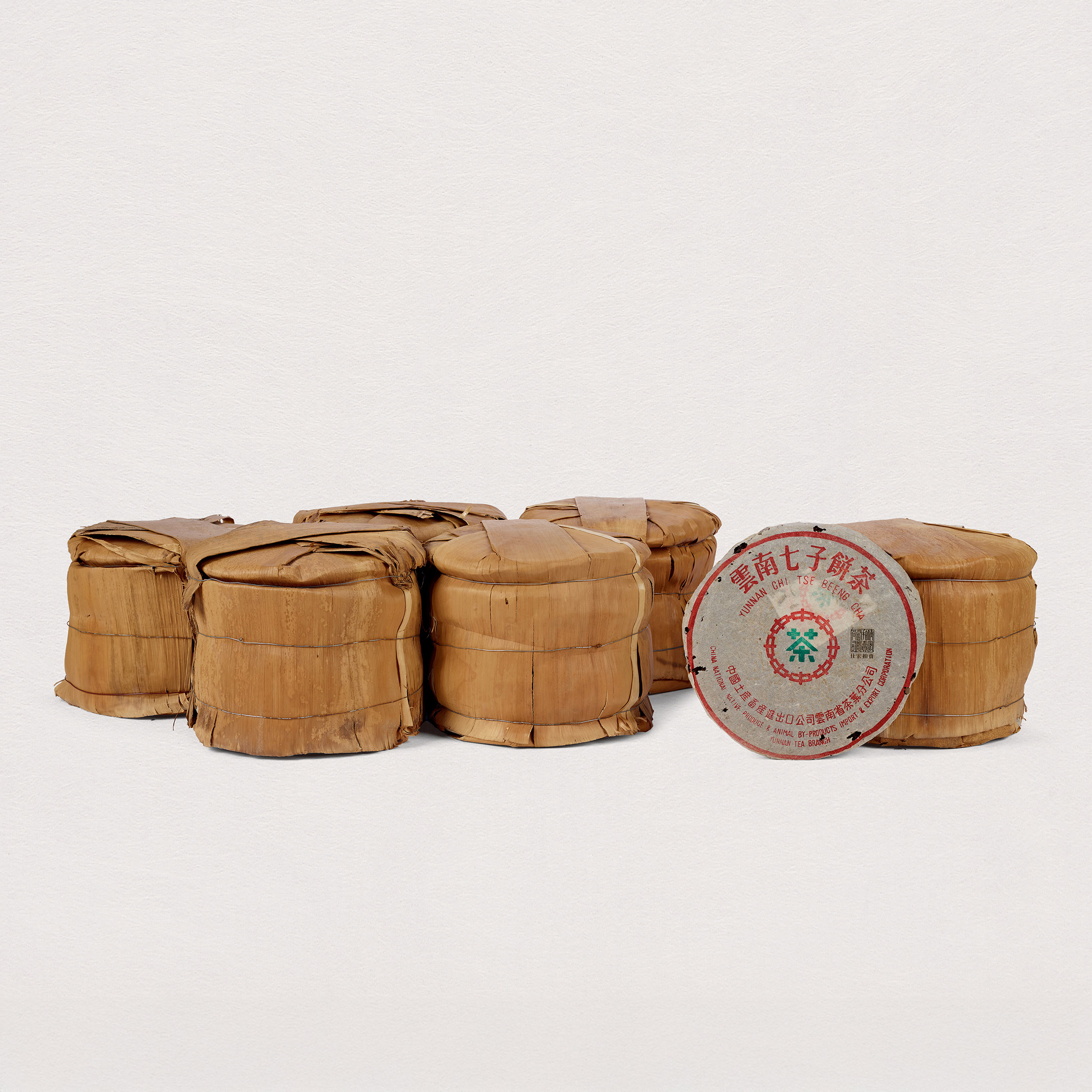 92青餅六筒共四十二片,無內票、有內飛,乾倉倉儲,薄紙包裝,內飛見繁體廠。其中頭尾包棉紙以加強保存,原包,保存狀態完整。是九十年代初勐海茶廠經典7542配方茶餅。92無飛茲因當年出口台灣,需去掉內飛,故92無飛實同屬88青同期出品。經過三十年陳化,已具備老茶茶氣與陳韻,是老茶愛好者體驗88青風味的另一選擇。