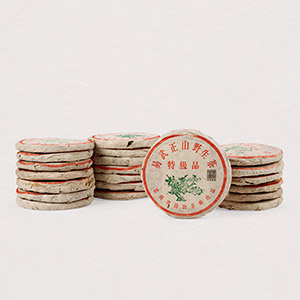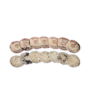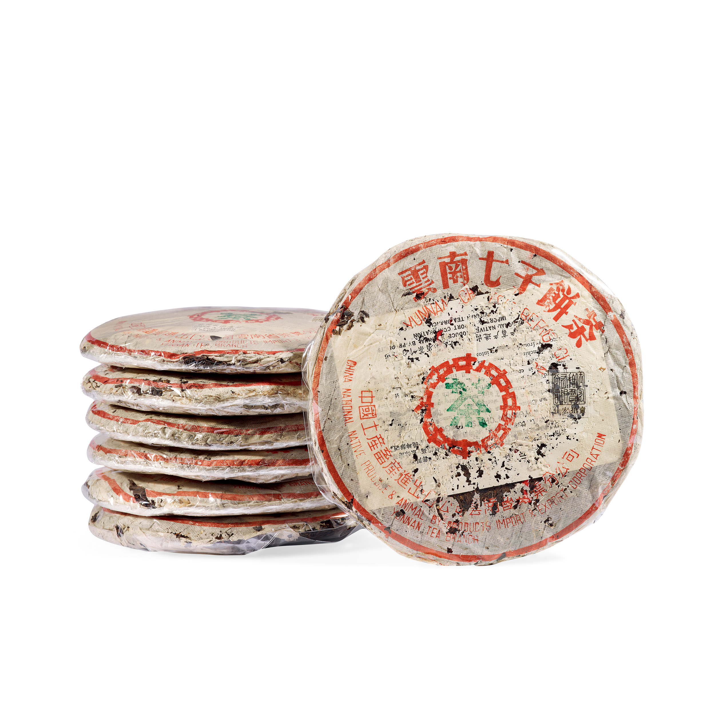 此七十/八十年代73青餅,一筒七片,偏乾倉儲存,大口中格紋紙、手工蓋小綠印,細字尖出内飛,保存狀態完整。七十年代薄紙批次,餅面灑滿幼嫩芽頭,裡茶肥壯,採用四級茶菁拼製,七十年代茶品仍保留春茶概念,同時亦屬最早期7542配方茶,作為標準化生產前茶品,風格別樹一幟。數十年陳化,陳韻茶氣十足,滿口甜醇餘韻豐滿。