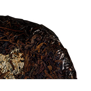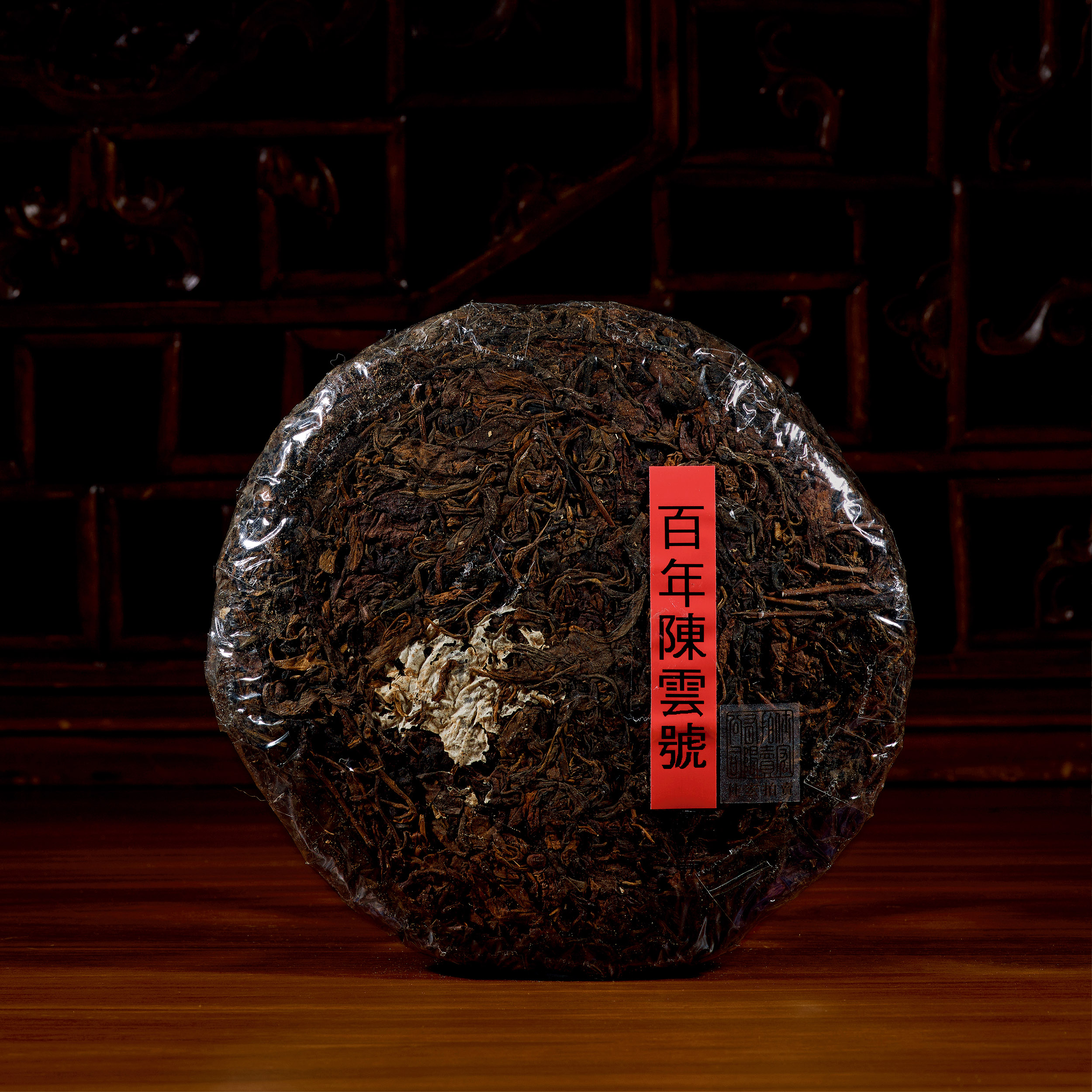 陳雲號白紙黑標一片,茶餅邊緣有補茶痕跡,自然倉保存。陳雲號為1910年代清末民初茶品,內飛為白紙黑字。在茶菁選採及拼配上皆有特色,風味各異,又以白紙黑字品格最高。 內飛依稀可見其標誌性太陽圖案及「陳雲貴印」字樣。餅取易武大葉種喬木茶菁,葉張厚重,條索扁短而緊結,呈深栗色,餅面油亮,經百年陳化,茶氣偏強,味正韻雅,充分體現易武正山茶醇和風味。
