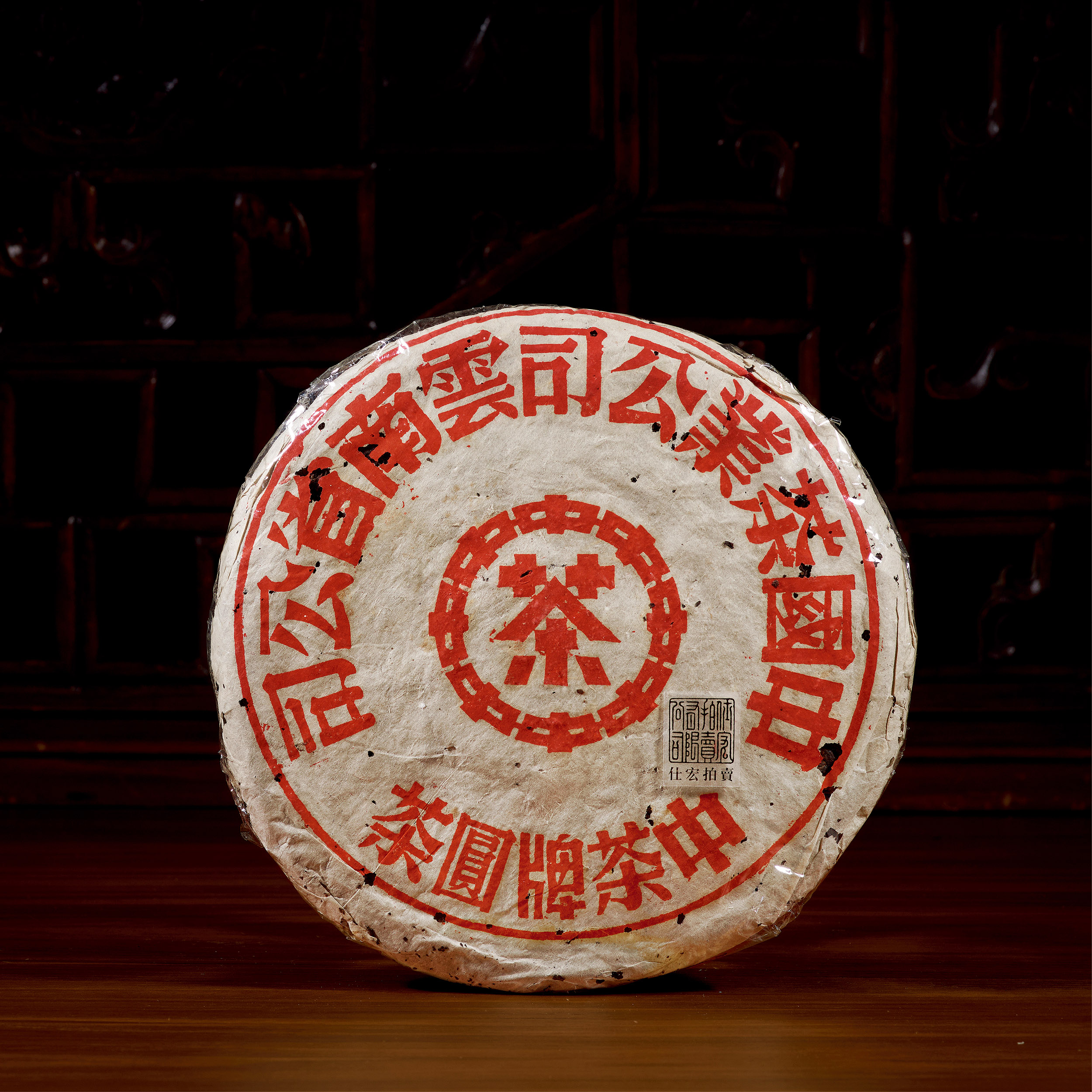 五十年代早期大字紅印青餅一片,乾倉儲存,保存完好,餅身厚實,手工纖維紙包裹,早期手工拓版本的八中茶字粗大,重量十足。紅印圓茶作為勐海茶廠開山之作,嚴選猛臘最好茶菁,只用最上乘單一茶菁為料,嚴謹芽葉配比,沿用傳統制茶壓模之法及壓製發酵方法。經七十年良好環境保存及陳化,愈陳愈香,茶質表現更出色,茶湯厚釅,具蘭樟香,茶氣持久,舌底鳴泉。