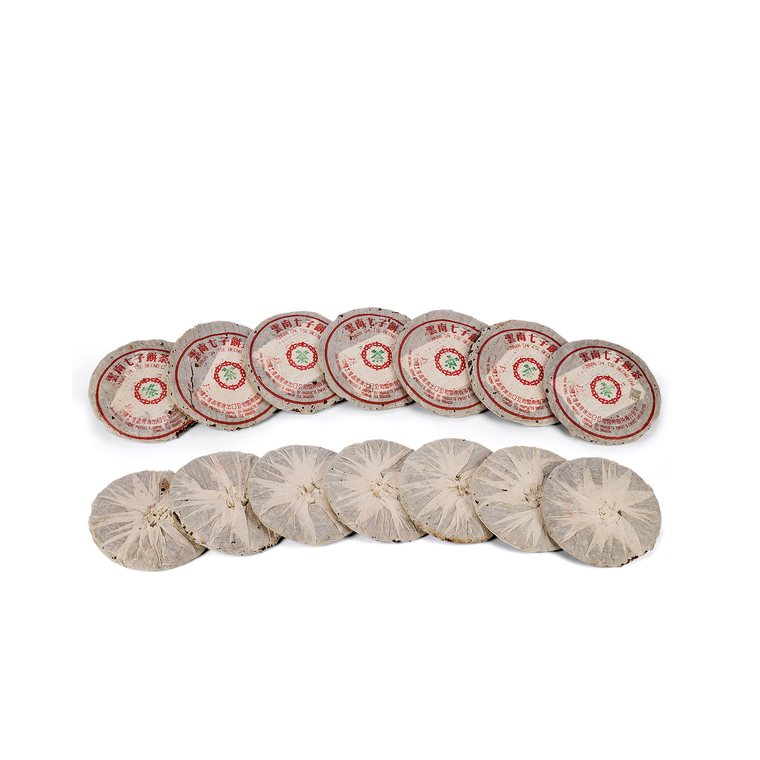 此七十年代大藍印圓茶一筒七片,自然倉保存,餅型較厚大,標準七十年代茶品包裝特色:大口中版。大藍印採取粗芽大葉,7682配方,是勐海茶廠最後一批用古董茶為原料的茶品,也是最早期採用具實驗性質發酵技術。近半世紀陳化,陳韻樟香兼帶甜香藥香,有印級風味,大葉茶菁後續陳化潛力可期。