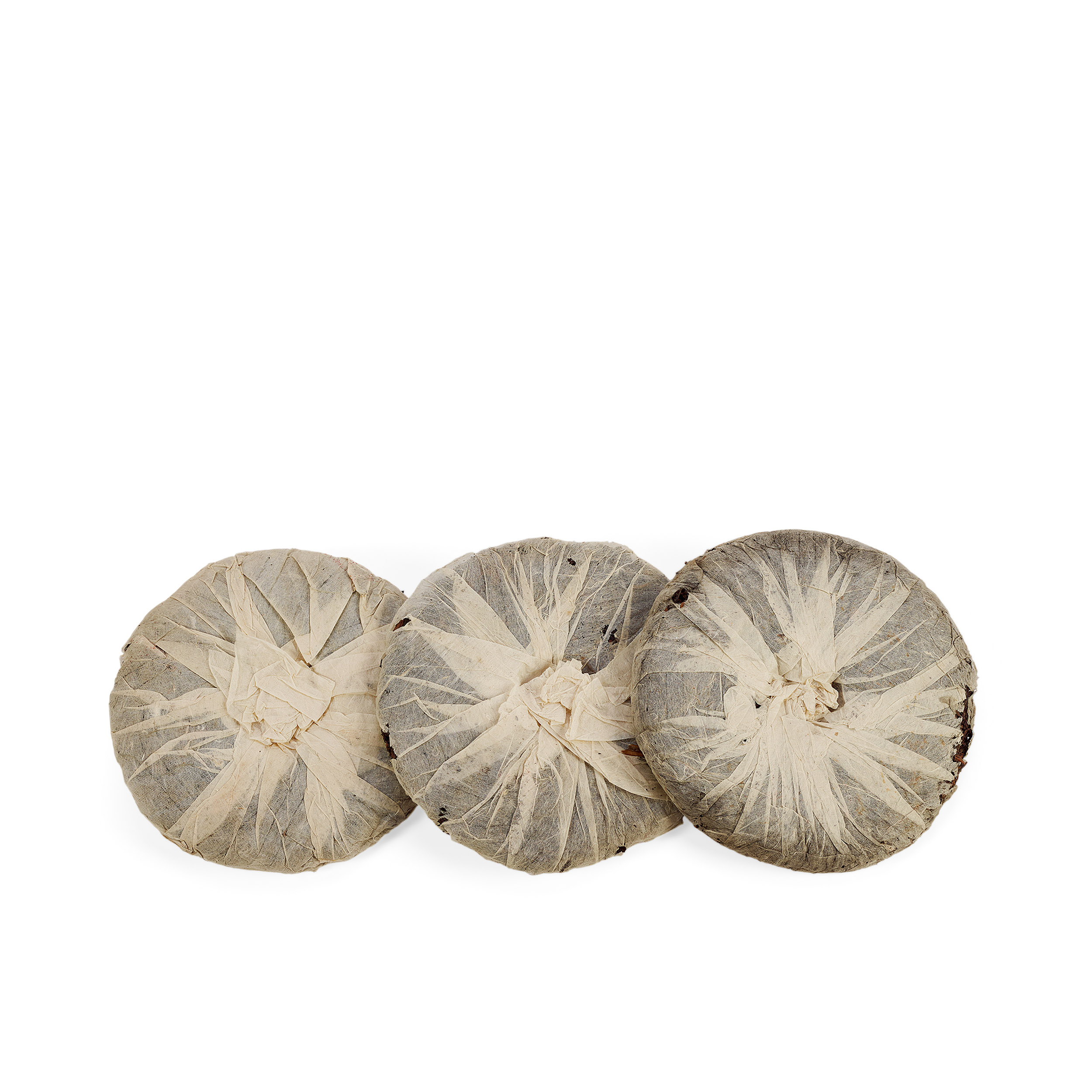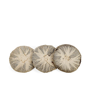 七十年代初大黃印圓茶共三片,薄紙稍有破損,自然倉存,原包以中壯茶葉摻入嫩芽及經過熱蒸發酵而成。餅身寬大偏厚,茶質優良,是別具特色且為數不多的交替期茶品。近五十年陳化,口感醇滑,帶有甜香,口感滋味、別樹一格。