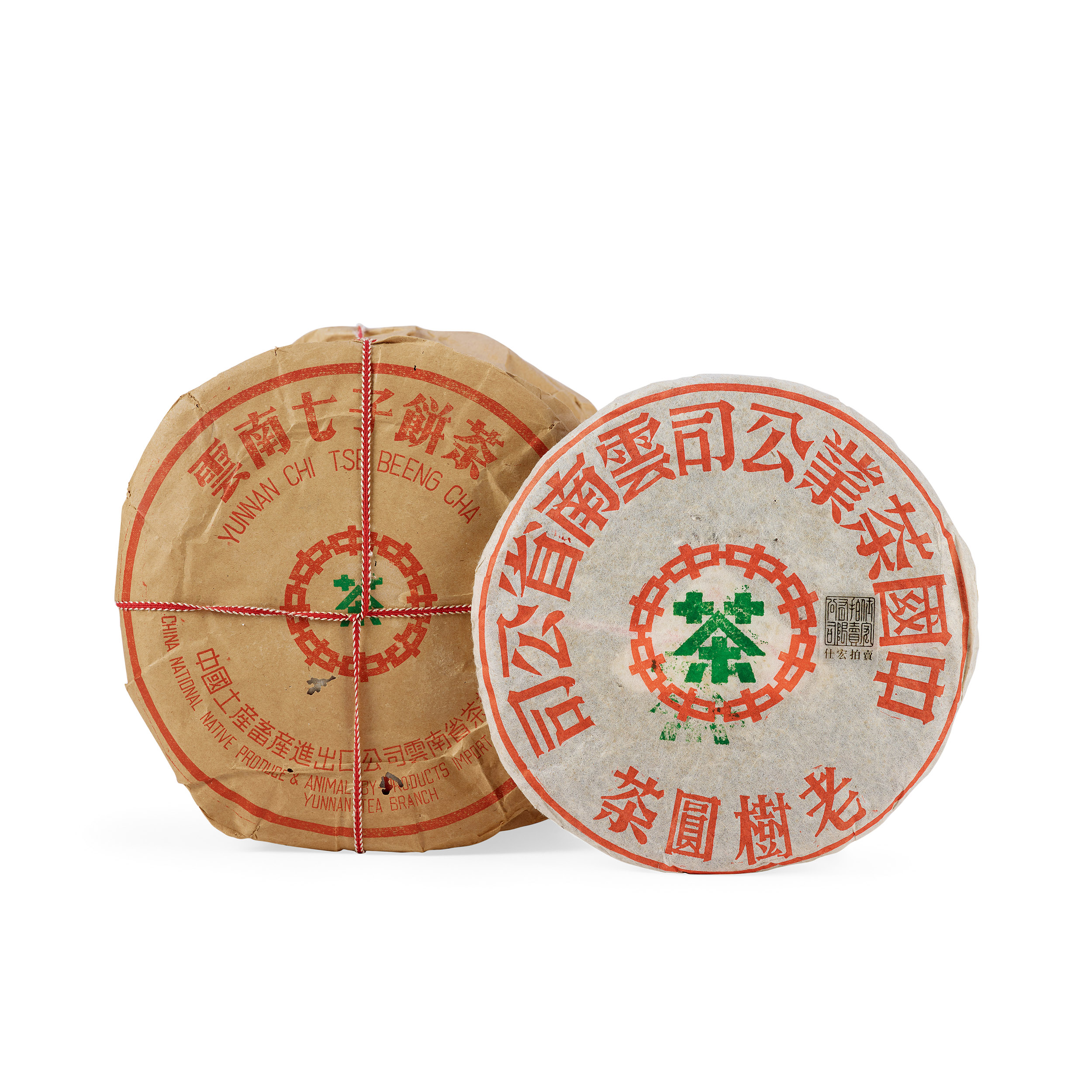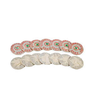 此1997年的97老樹圓茶原牛皮紙筒共七片,乾倉倉儲,是最早班章概念的高級訂製茶品,每片茶餅壓有紅絲帶,內飛寫有「喬木老樹」,為香港、台灣等茶商共同向勐海茶廠訂制出口台灣的首批以產地為主題,取班章大樹純料而制,有別於其他的嘜號以各地毛料拼配而成,總出廠量只有數十大件經廿多年陳化,茶韻豐富,備受市場推崇。