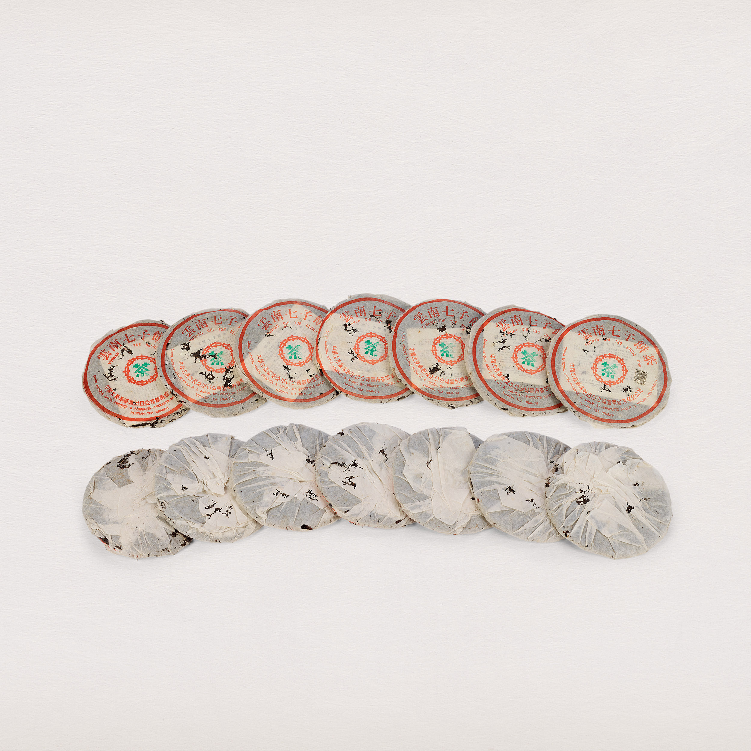 此94業字青餅(8582配方),四筒共二十八片,偏乾倉倉儲,外包裝紙張破損、稍有蟲蛀,見薄棉紙包裝上印錯版業字,也是細字平出內飛最後一批。餅身紮實、條索分明、餅面金毫顯露,湯色栗紅透亮,有特殊的蔘香味,湯質濃鬱、膠感厚實,茶氣強烈厚重,回甘生津。陳化表現媲美88青,乃勐海茶廠90年代佳作。