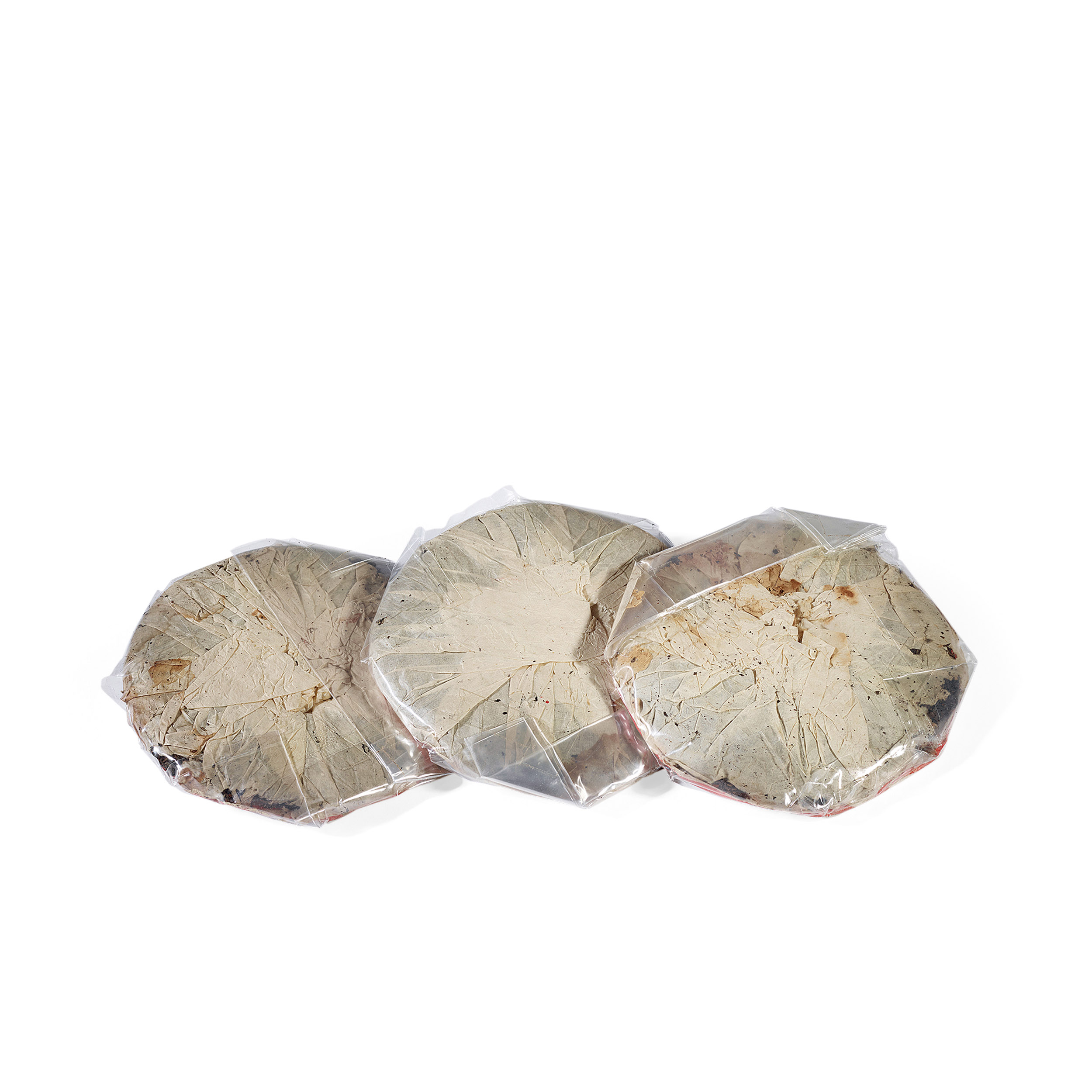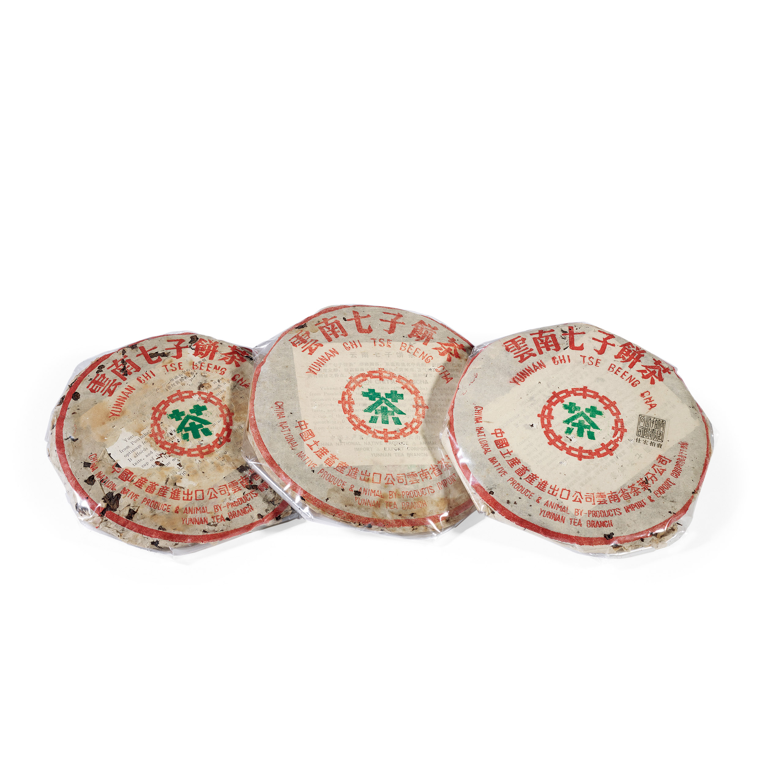 八十年代初雪印青餅三片,傳統香港倉儲,包裝完整,餅身較小,短內票,其中一片帶有跡。以7532為配方拼配,餅面細芽多,一心一葉,以三級茶菁原料,面裡一致為主,雪印乃勐海茶廠出品中最為細嫩的高級別茶品。茶質陳化優秀,經四十多年陳化,茶色紅亮,水性柔軟,滋味馥鬱。
