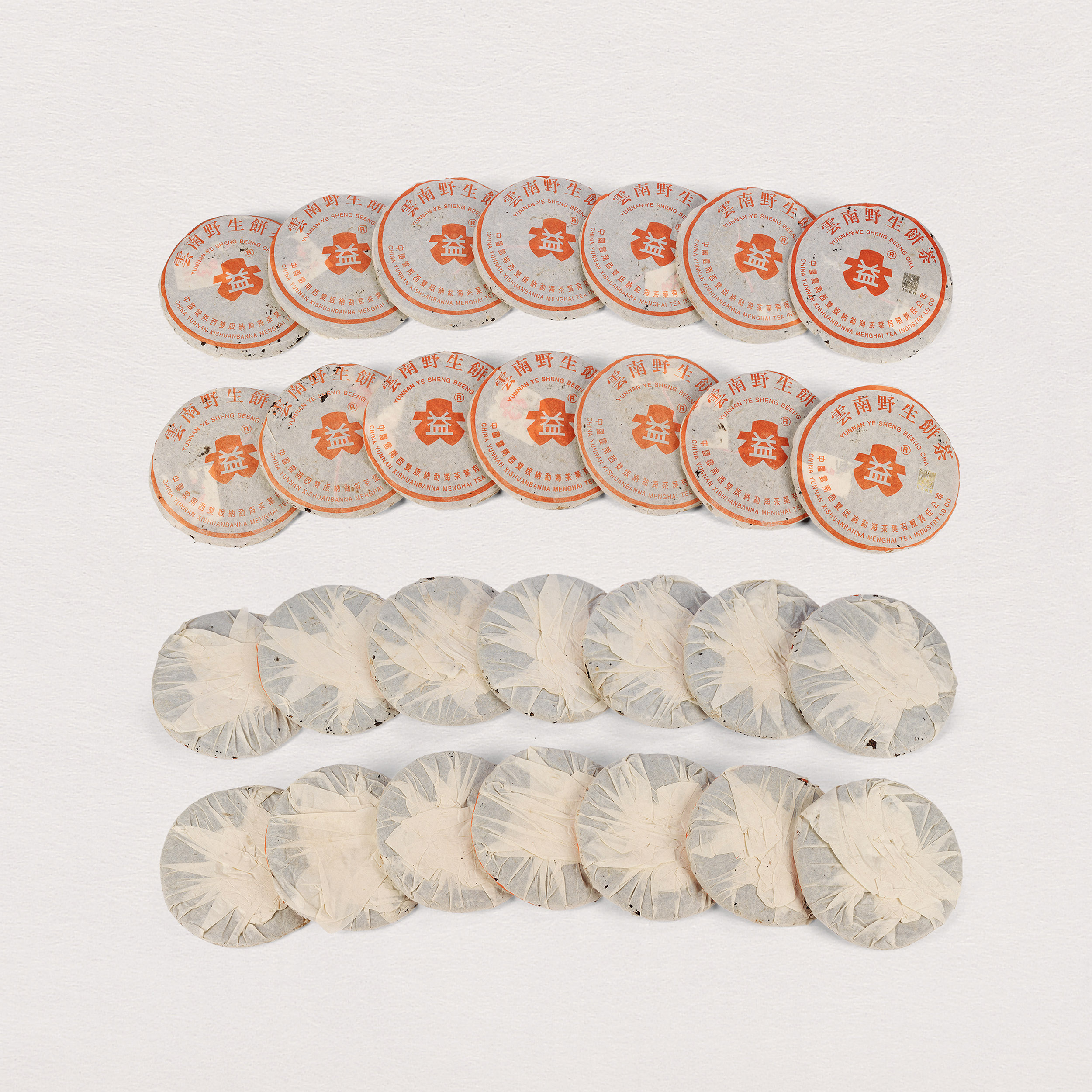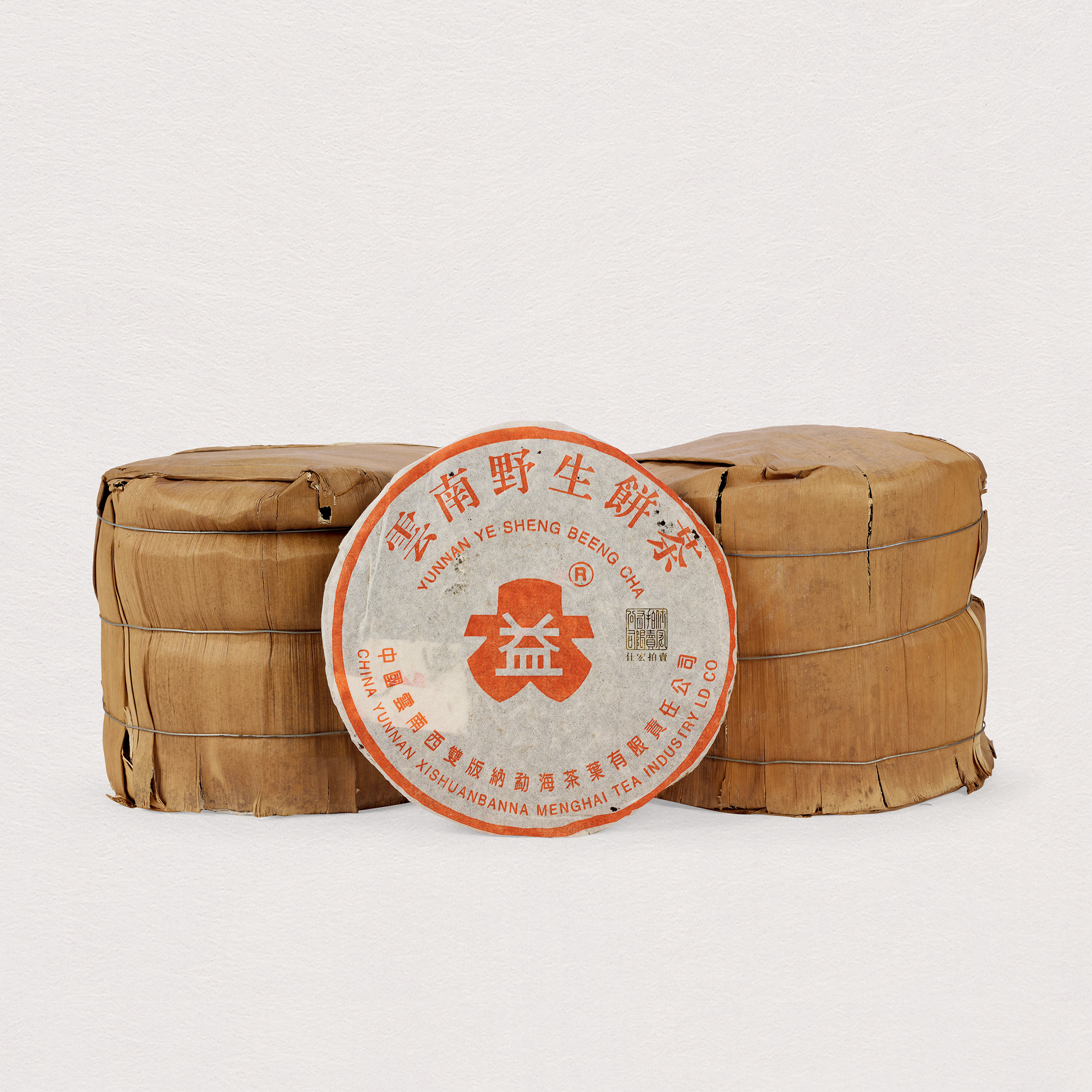 1998年大益野生紅絲帶青餅兩筒共十四片,純乾倉倉儲,保存完好,硬竹箬包裝。外包裝有R大益商標及註明「中國雲南西雙版納勐海茶葉有限責任公司」。茶餅見「野生餅茶」內飛與紅絲帶,乃香港茶商訂制高級茶品的記認。同樣採用7542配方,大益野生紅絲帶茶精乃優中選優,選取早期野生喬木茶菁,以芽頭為料,茶氣帶班章味,經過近三十年陳化,茶氣茶韻出,訂制茶產量不多,市場較少見。