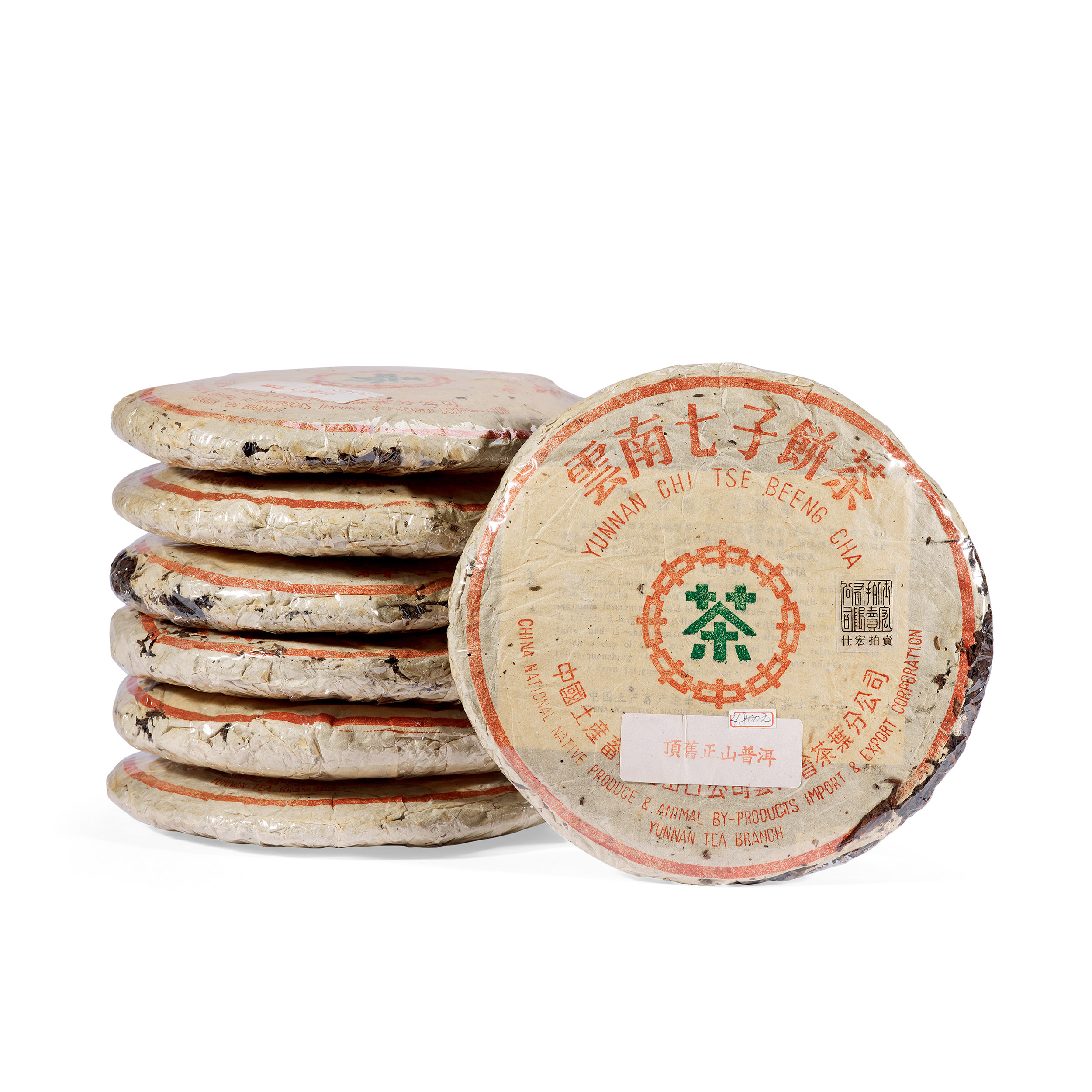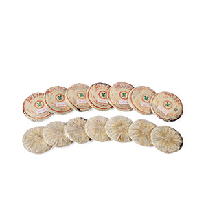 此七片八十年代中期厚紙8592圓茶,倉儲為自然倉,原包,厚黃棉紙,保存完整,其中一片稍有破損。8592屬8582同期姐妹茶,為1987-1988年間香港南天貿易公司向進出口公司訂製的獨立研發的專銷品,產期比1988年的紫天版8592來得更早。由勐海茶廠渥堆發酵而成的早期熟餅,堪稱熟茶標桿之品。茶湯栗紅,茶韻甘醇,具有經典的蔘香兼棗香熟茶韻味。