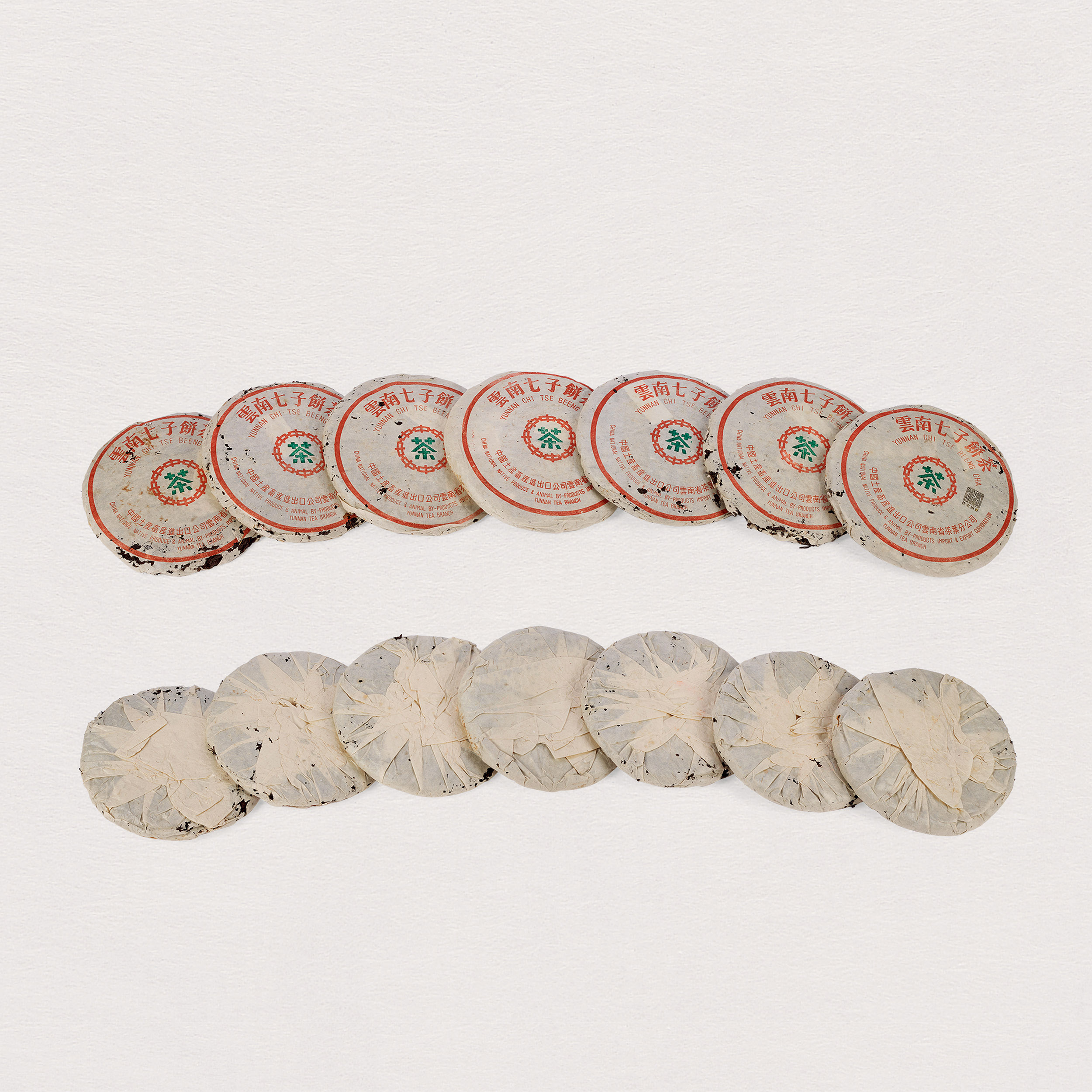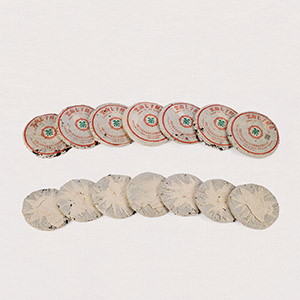 此八十/九十年代厚紙8592圓茶(小票版)兩筒共十四片,無內飛,附小票,採用9級粗茶原料,8592普洱茶餅乃8582的同系茶品,由勐海茶廠渥堆發酵而成的早期熟餅,堪稱熟茶標桿之品。茶湯栗紅,茶韻甘醇,具有經典的蔘香兼棗香熟茶韻味。熟茶氣味經陳化後更加清雅淳厚。