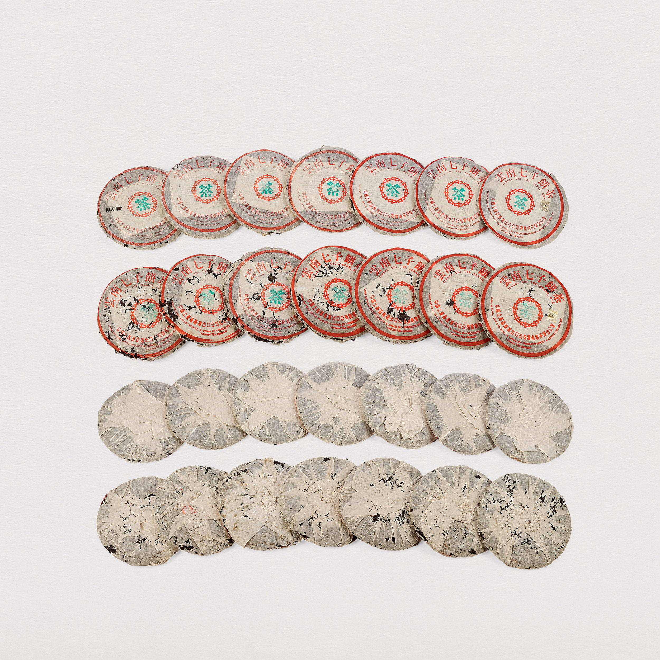 97水藍印青餅(7542配方)四筒共二十八片,偏乾/自然倉儲,薄棉紙外包,水藍色八中茶字,包裝稍有破損,屬勐海茶廠1997年產7542配方,取上好特級春芽為料。97水藍印乃勐海茶廠廠長鄒炳良在廠的拼配茶收官之作,亦被業界稱為88青餅的「接班茶」。經過近三十年陳化,茶氣老韻,陳香漸增。