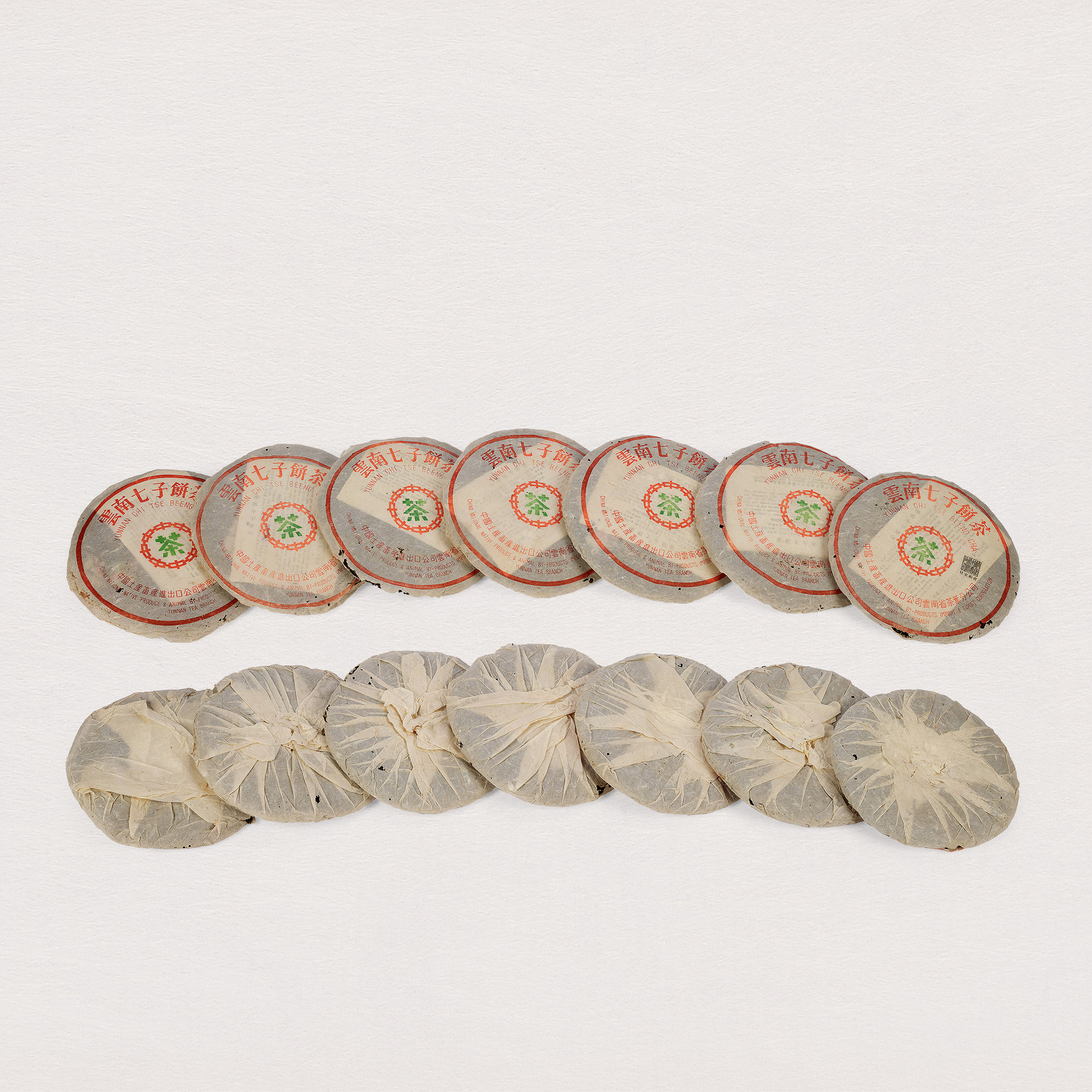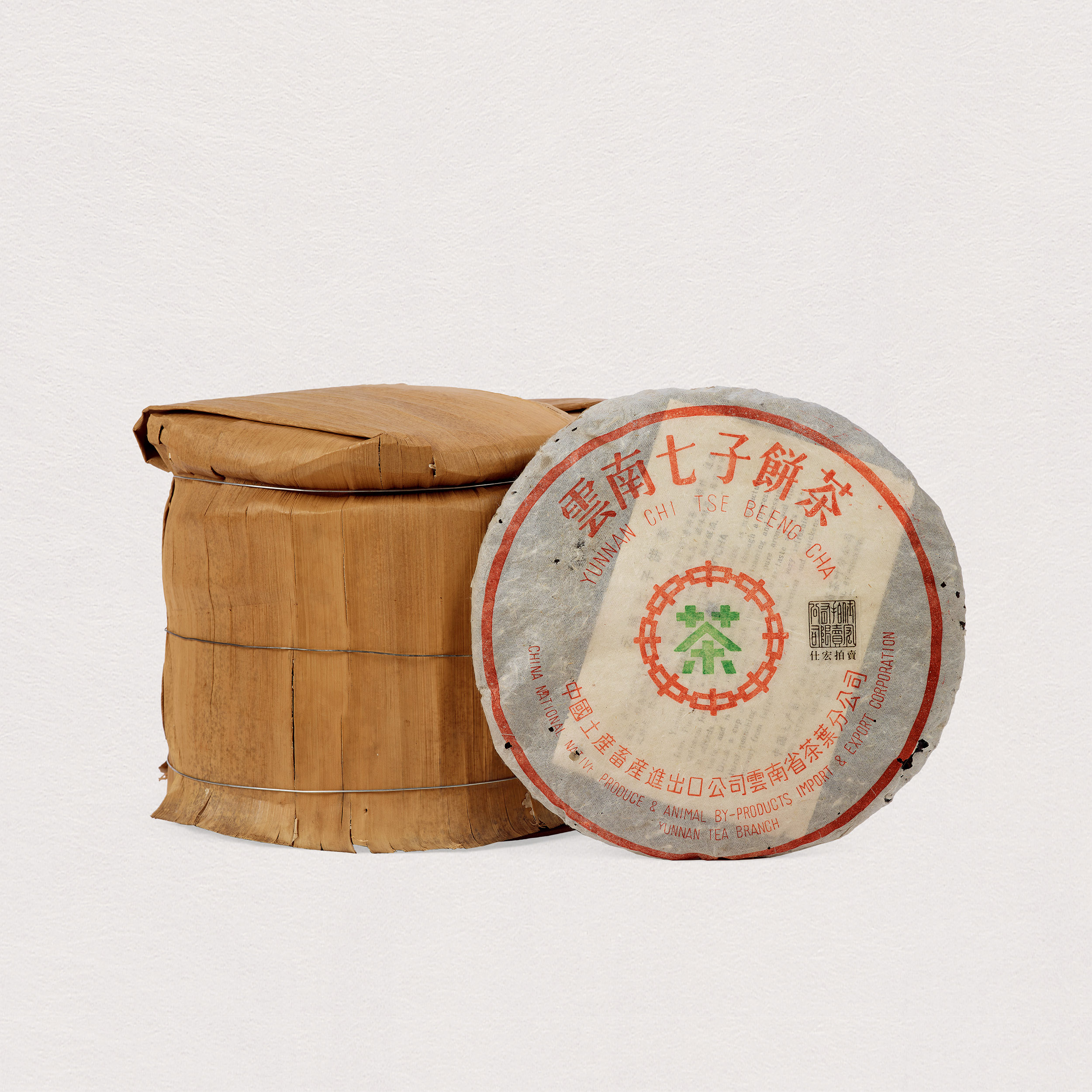 八十年代薄紙8582青餅一筒七片,乾倉儲存,餅身厚實,以五至八級粗壯茶芽拼配,以七八級為主。陳化數十年後,滋味純正、回甘強烈。8582青餅是香港南天貿易公司於1985年起向勐海茶廠訂製茶品,當年的8582是為了配合市場需求,調配臨滄茶區粗壯茶菁,其所用茶菁等級略優,口感韻味,表現穩定。經近四十年陳化,茶氣十足,樟香味強。條索金黃油亮,舌面生津。
