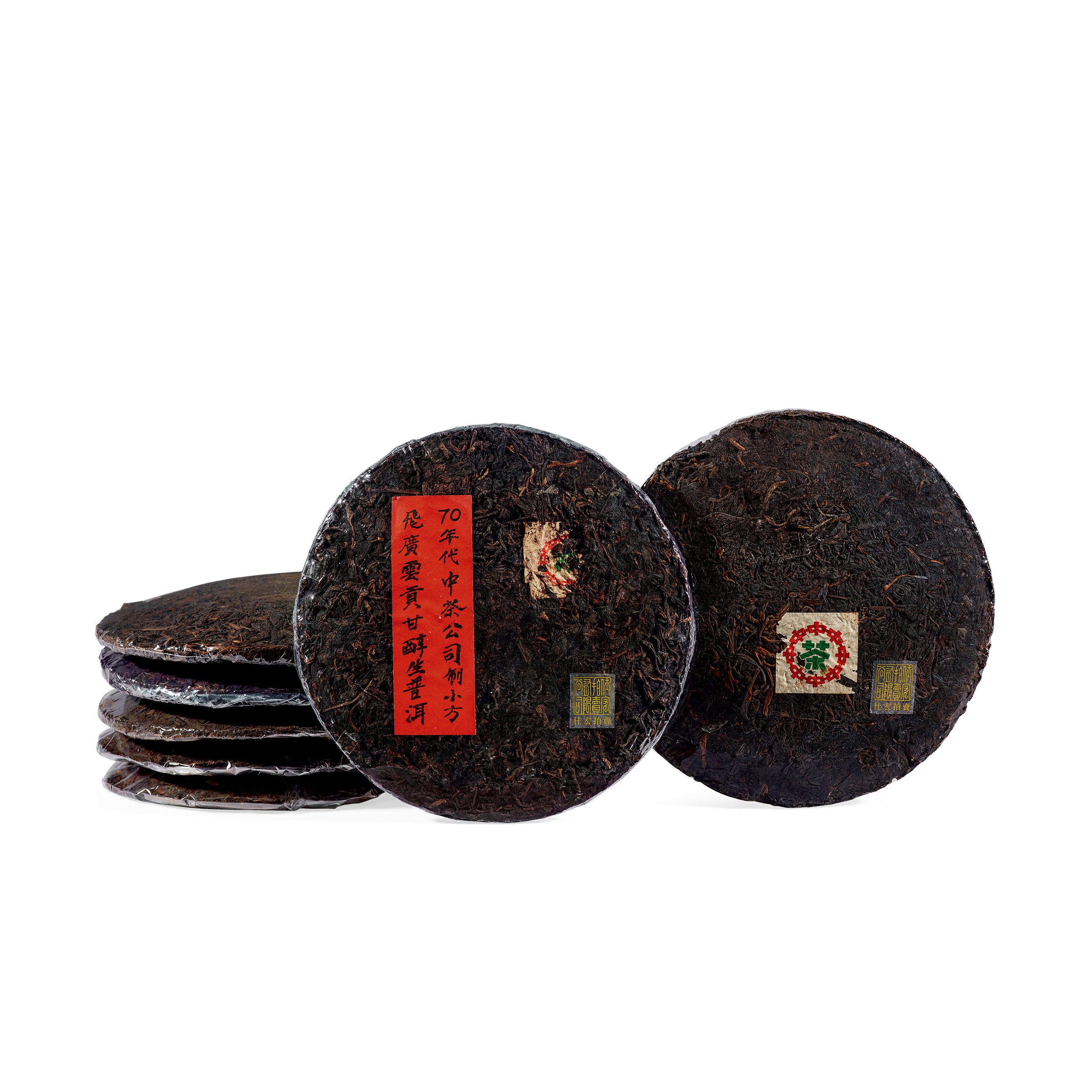 此六十/七十年代的廣雲貢餅共十四片,自然倉保存,茶餅埋有八中茶小方票,廣東所使用鐵模壓制窩底較細小,餅形緊實。六十年代選料自雲南調撥茶菁,於廣東壓制餅,有小貢茶美稱。陳化五十年多的廣雲貢茶,估價相對同年份的雲南七子餅為低,是對有年份追求的普洱藏家另一不錯選擇。