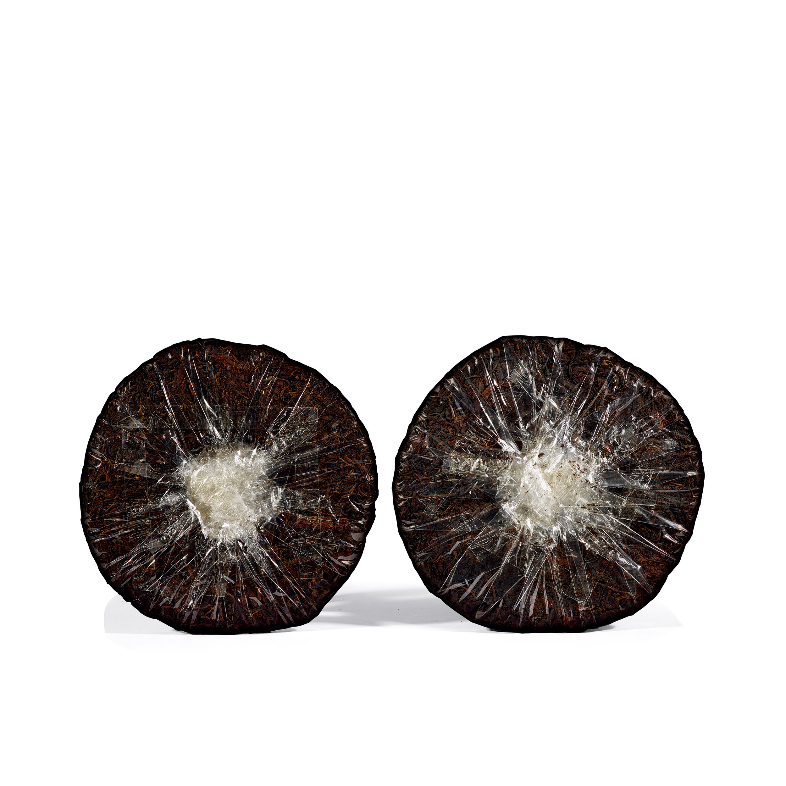 五十年代無紙紅印兩片,偏乾/自然倉儲,餅形完整,條索粗壯飽滿,選用猛臘野放老樹茶菁,舊式技藝壓模,餅麵茶面明顯精工揉製,兼有蘭樟之香。陳化至今近七十載,茶氣十足,茶韻醇厚,輕微雜味。據載,無紙紅印之所以無包裝紙是與香港早年儲存和銷售習慣有關,卸去包裝紙更有利陳化、存放和銷售。時至今日,無紙紅印成為號級茶的承接者,印級茶中的瑰寶,在普洱界中無人不曉。市面上越趨稀少,深受藏家追捧。