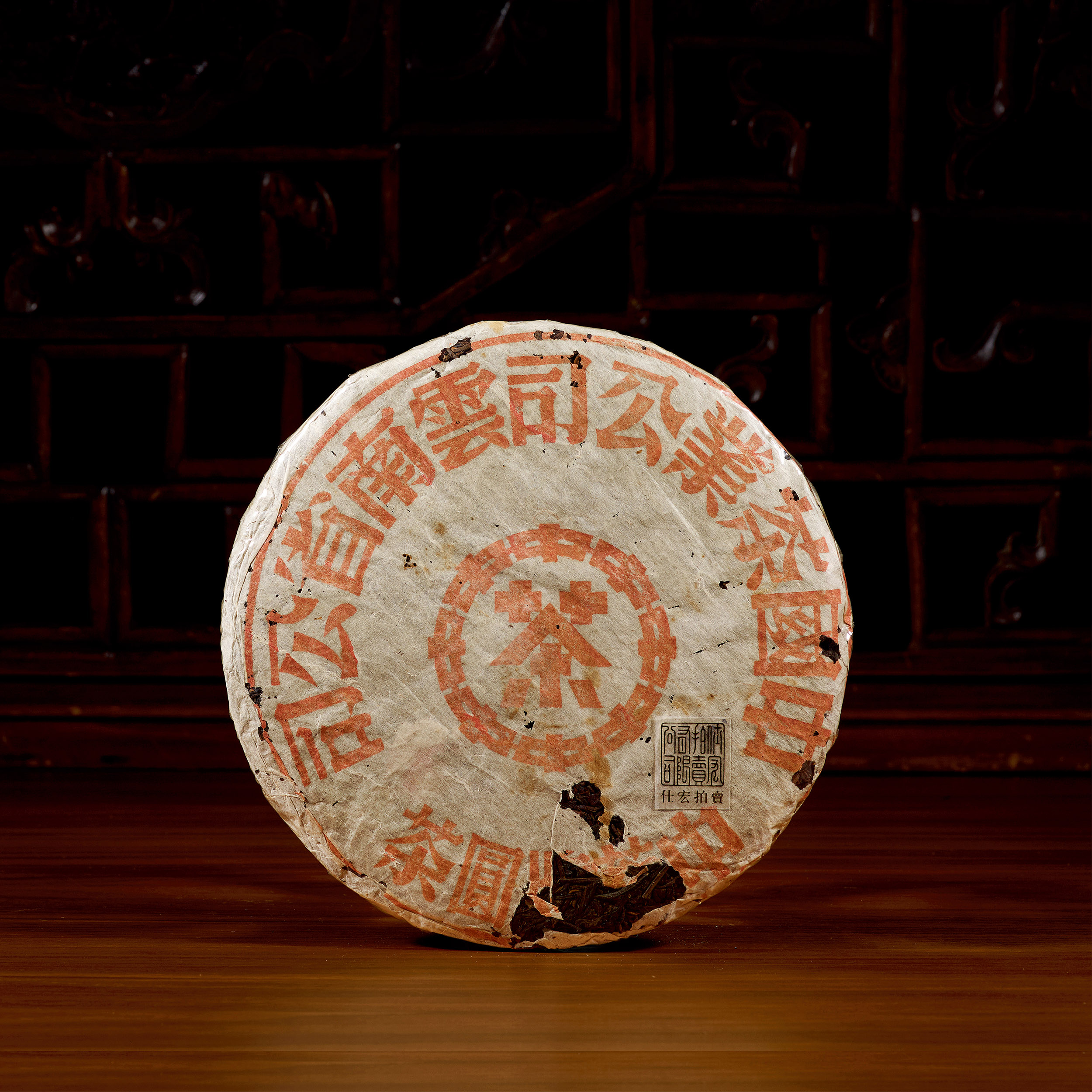 此一片五十年代紅印鐵餅自然倉,重量十足,餅頭幾沒破損。紅鐵茶面採用猛臘優質茶菁,加重萌芽配方,條索長而壯碩,背面亦配有條索及芽面,因特殊的金屬模具蒸壓工藝,茶葉膠質豐富,茶餅緊結密實,不易撬開,因此倉儲陳化速度緩慢,故而紅印鐵餅雖茶質優良,但上市之初卻遭冷遇,甚至中斷生產,後來方被慧眼識珠,在普洱茶市場上獨領風騷。鐵餅緊壓工藝使茶體陳化轉變速度放緩,卻可長久保持活性。