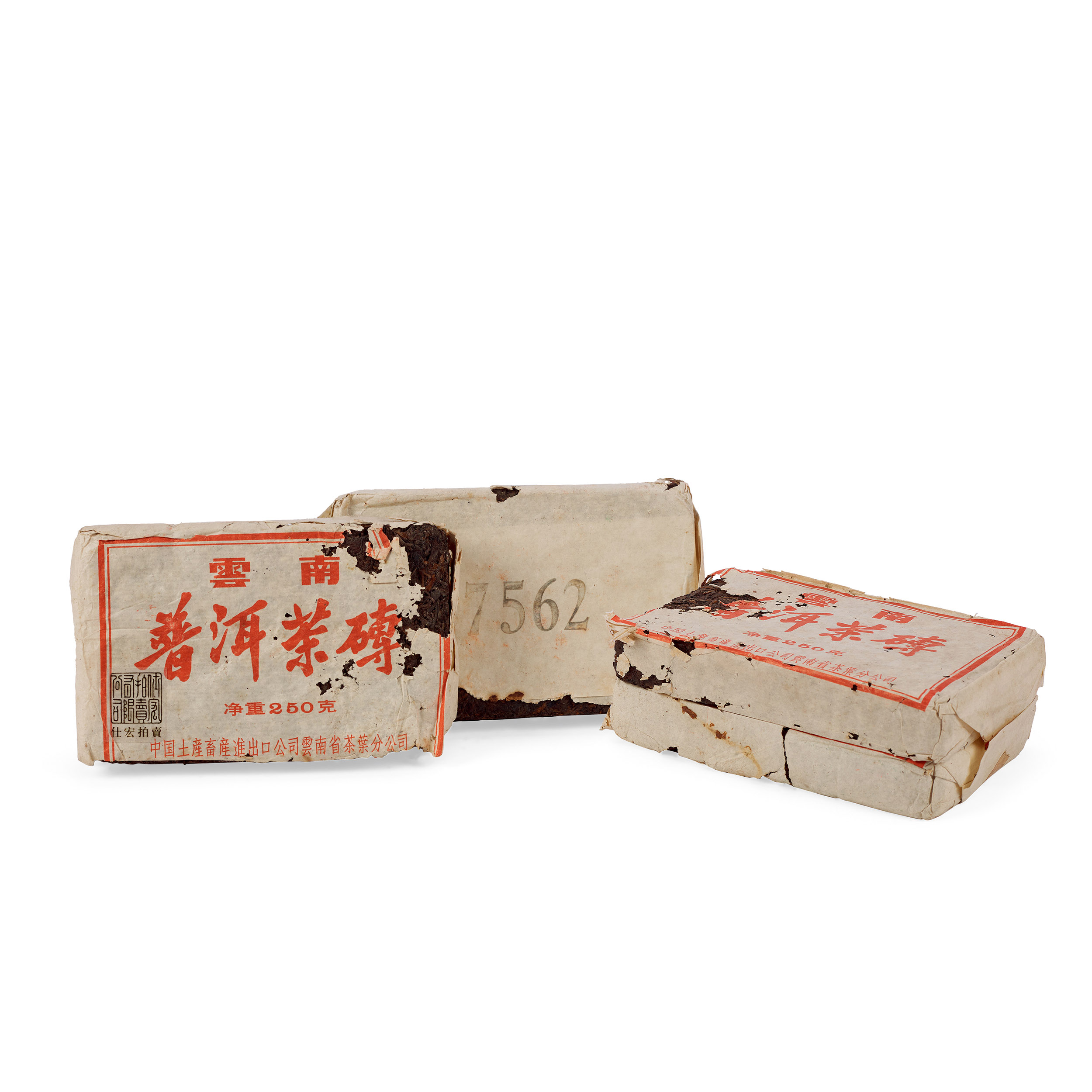 此7562勐海磚茶四塊,採用下關臨滄大葉種灌木茶菁,於勐海茶廠壓制,後蓋7562字樣外包紙稍有破損,為文革磚的延續。茶菁以二級幼嫩茶菁為料,摻拼碩壯茶芽,芽頭鋪面,茶面金黃,餅型堅實,背面有布壓痕跡。歷五十多年陳化口感飽滿,7562產量不多,加上茶菁經特別挑選,市場評價頗高。