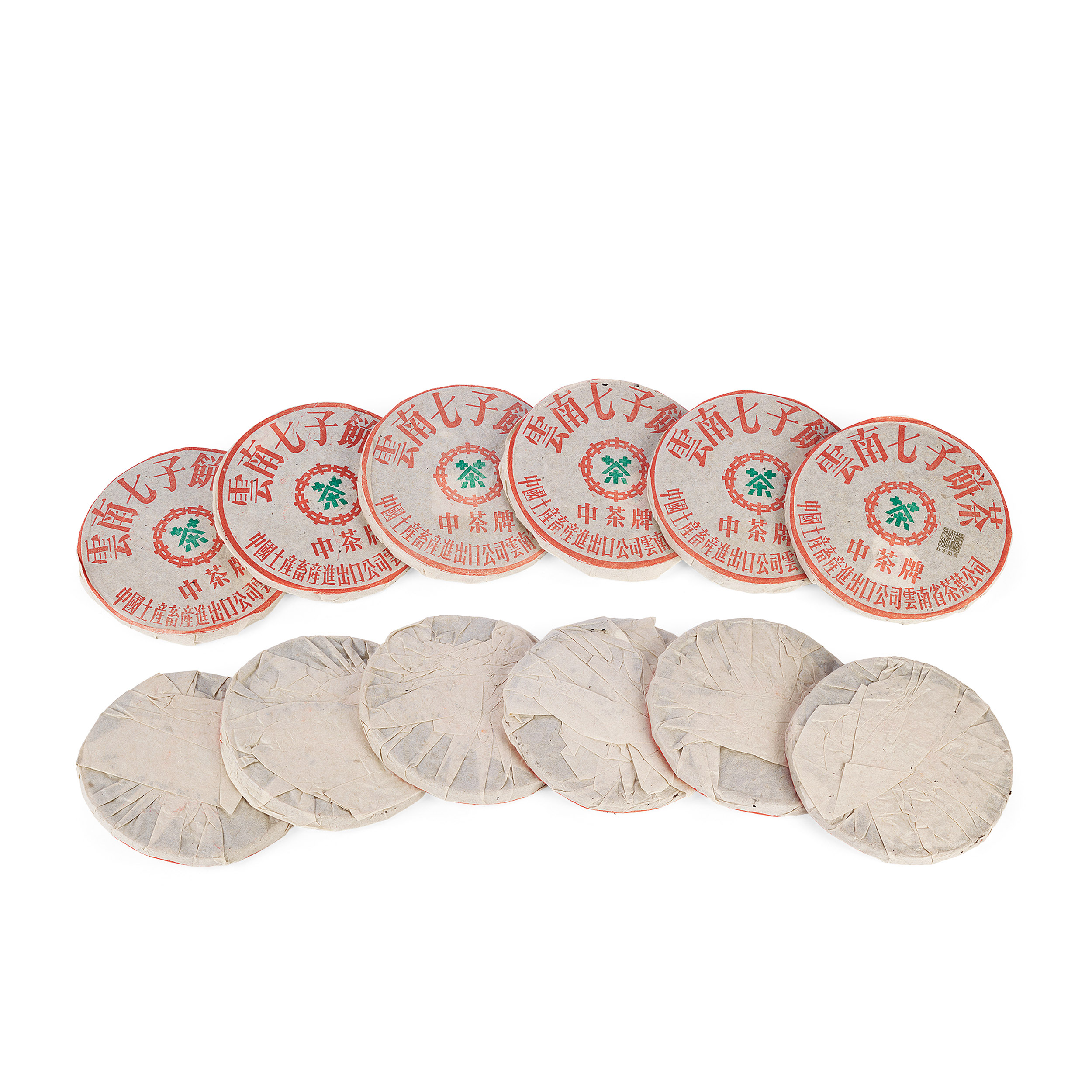 2003年中茶牌繁體紙鐵餅六片,黑短飛版。因其口感獨特,轉化優異,又名03下關小飛鐵。有別於傳統下關茶取臨滄、景穀茶菁,此2003年版本有別於其他下關鐵餅,採用勐海茶菁下關茶廠壓制,簡體黑短字下關茶廠的內飛呈4cm×4cm的正方形,後期陳化口感風格獨特 茶氣帶松煙香,茶湯滋味濃烈,回甘生津,是下關2000年代的明星茶。
