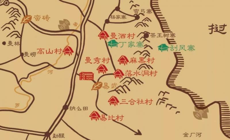 易武七村 : 麻黑村、高山村、落水洞村、曼秀村、三合社村、易比村、曼撒村。