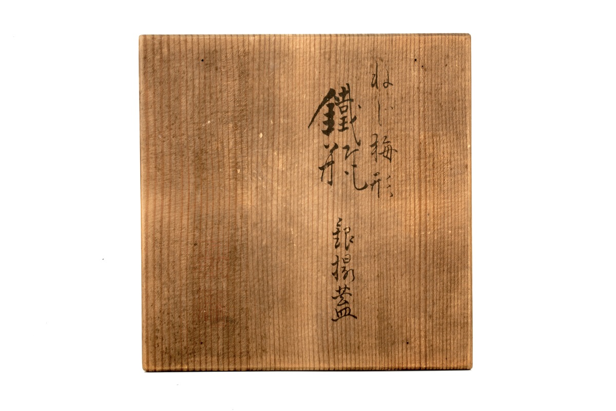 壶盖内刻有「金寿堂」。共箱,箱盖题「梅形铁瓶 银揭盖」,箱盖内「金寿堂」款及雨宫宗花押。附证书两张。
