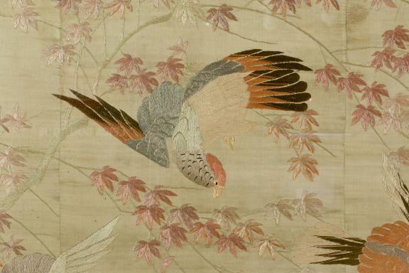 此藏品形製硕大,丰富的色彩造就层次多变的优雅气息,花卉翘首绽放,粉嫩吐蕊;灵鸟纹样栩栩如生,跃跃欲活,颇有「绣花花生香,绣鸟能听声,绣虎能奔跑,绣人能传神」的气韵。整幅藏品色彩富丽夺目,施针简约,构图缜密巧妙,雅然天成;精湛工艺不言于表。