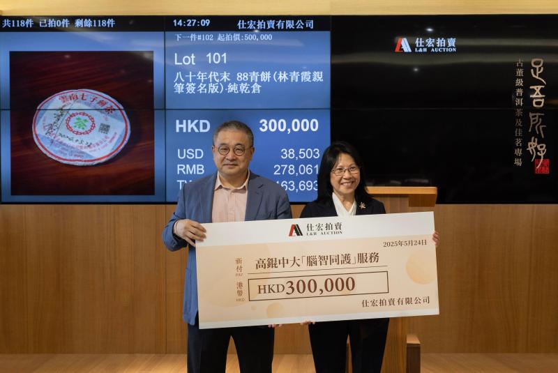 The charity highlight of L&H 2025 Spring Auction - A Piece of 88 Pu-er Tea Cake Signed by Brigitte Lin, Circa Late 1980s - sold for HK$ 300,000 with no buyer’s premium.