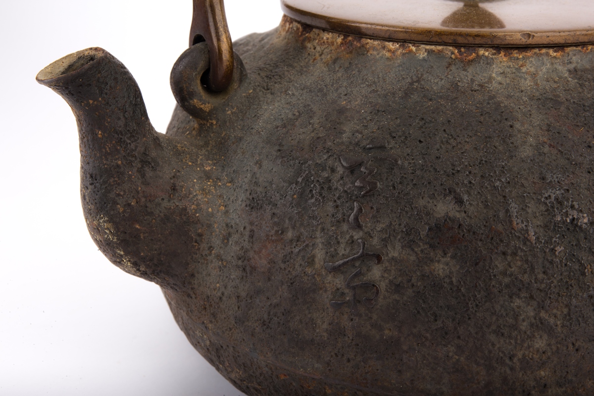 平丸造型鐵壺,呈荒地肌紋,通體樸拙素雅。壺腹一面題「一粒萬倍」,此為日本曆法中其中一個特別的吉日,有豐收之吉祥美意;另一面則浮雕枝葉,靜謐端莊,和風雅然。配花苞鈕摘與菊花形摘座,在粗獷的肌理紋鐵壺上,巧添柔和婉若之姿。