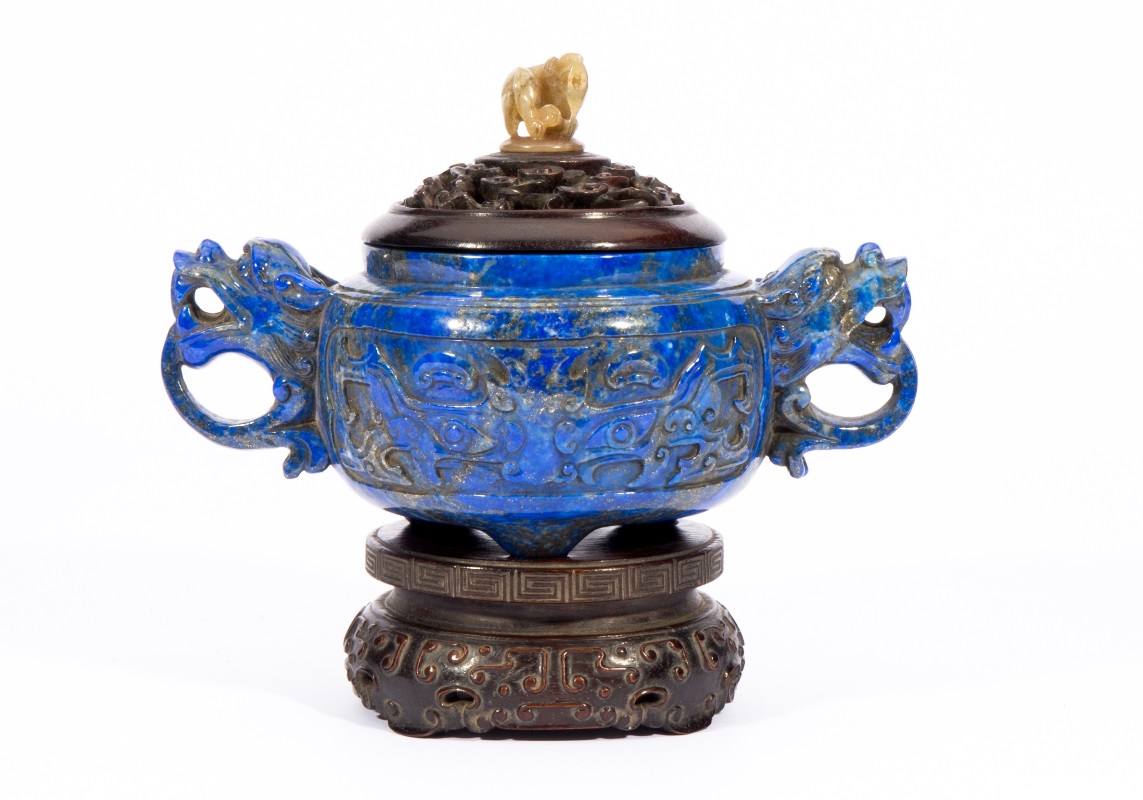 此爐造形古樸敦厚,胎質厚重;鼓腹圓直筒,下底弧收圈足,通體以青金石雕,罕有矜貴,晶瑩溫潤;青金石的歷史與多國家的皇室相連,有著特殊的王室能量,象徵智慧、權力、財富、尊重等等。外壁飾凸起弦紋,巧雕饕餮紋於爐腹,靈氣逼人;附龍耳一雙,唐木龍蓋通體雕如意雲紋,有意飛龍在天,相互呼應,頗見匠心。唐木爐座飾回紋繞緣一圈,手工細膩,值得再三賞玩。
