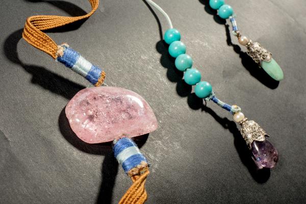 朝珠為清代朝服上佩帶的珠串,屬於一種佩掛物垂於胸前。朝珠共有一百零八顆,每廿七顆間穿大珠一粒,此為分珠,合共四顆大珠。朝珠的質料有翡翠、瑪瑙、東珠、藍晶石及珊瑚等。每盤朝珠有四個大珠,垂在胸前者稱「佛首」,在背後還有一下垂的稱「背雲」;另外兩則各有三串小珠,左二右一,各十顆。按清《會典》規定,自皇帝、後妃到文官五品、武官四品以上,皆可配掛朝珠,故此藏品絕對是身份的象徵。