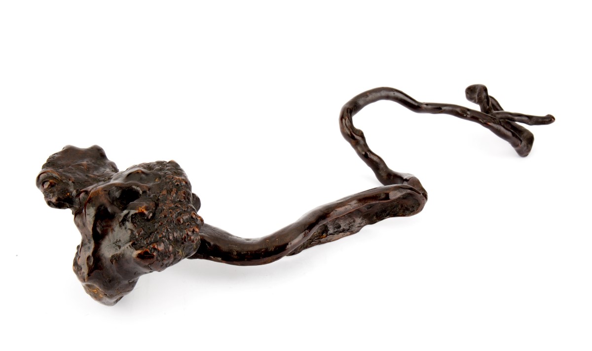 此木如意為整枝根結奇木自然成形,不假堆飾。如意頭褶皺紋理自然豐富,邊緣隨勢略加整治。如意柄盤繞多姿,造型古樸雅拙,富自然之美。此藏品包漿皮殼厚實而鮮明,宜作收藏或手持把玩。