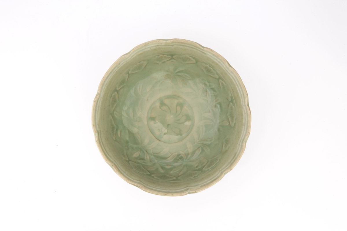 釉色粉青瓷碗,形制端正,釉厚色青,菱花口沿見花瓣紋裝飾,內壁佈滿菊花圖案,予人朝氣之感外,更有「吉發」的美意。碗形規整,胎體厚實,帶有明代龍泉窯精細的風格。