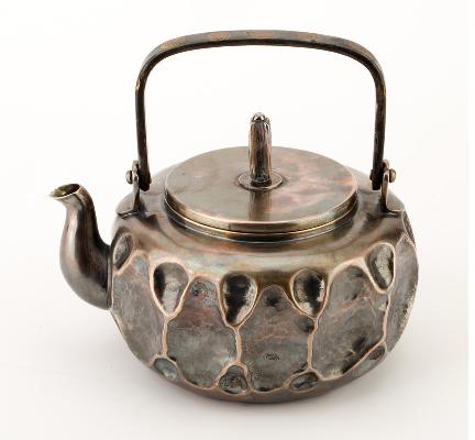 此藏品純銀鍛造,形制罕見;壺蓋及平肩光素,壺腹飾大槌目紋銀壺,造型大膽現代中又見古樸風雅;三彎流,配纖細直立方正弧角提把,提把上鑲銼金螺旋紋,配以高身摘紐,拉長壺身比例。