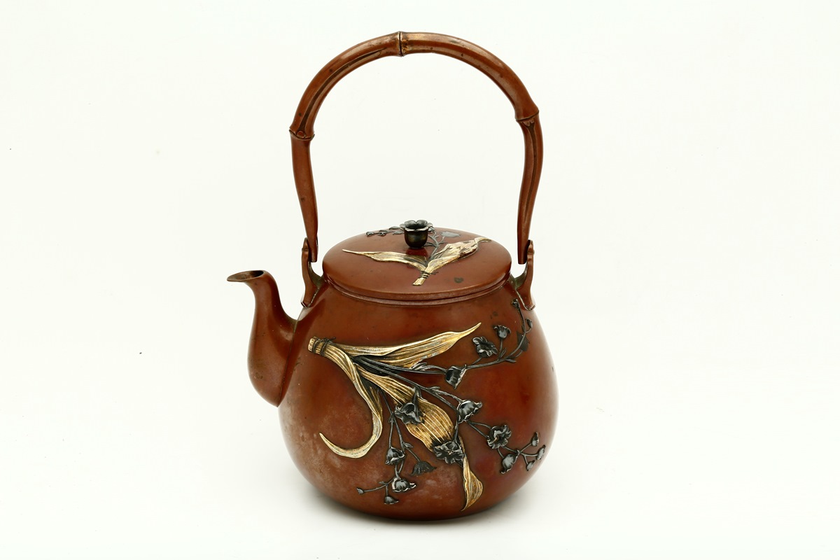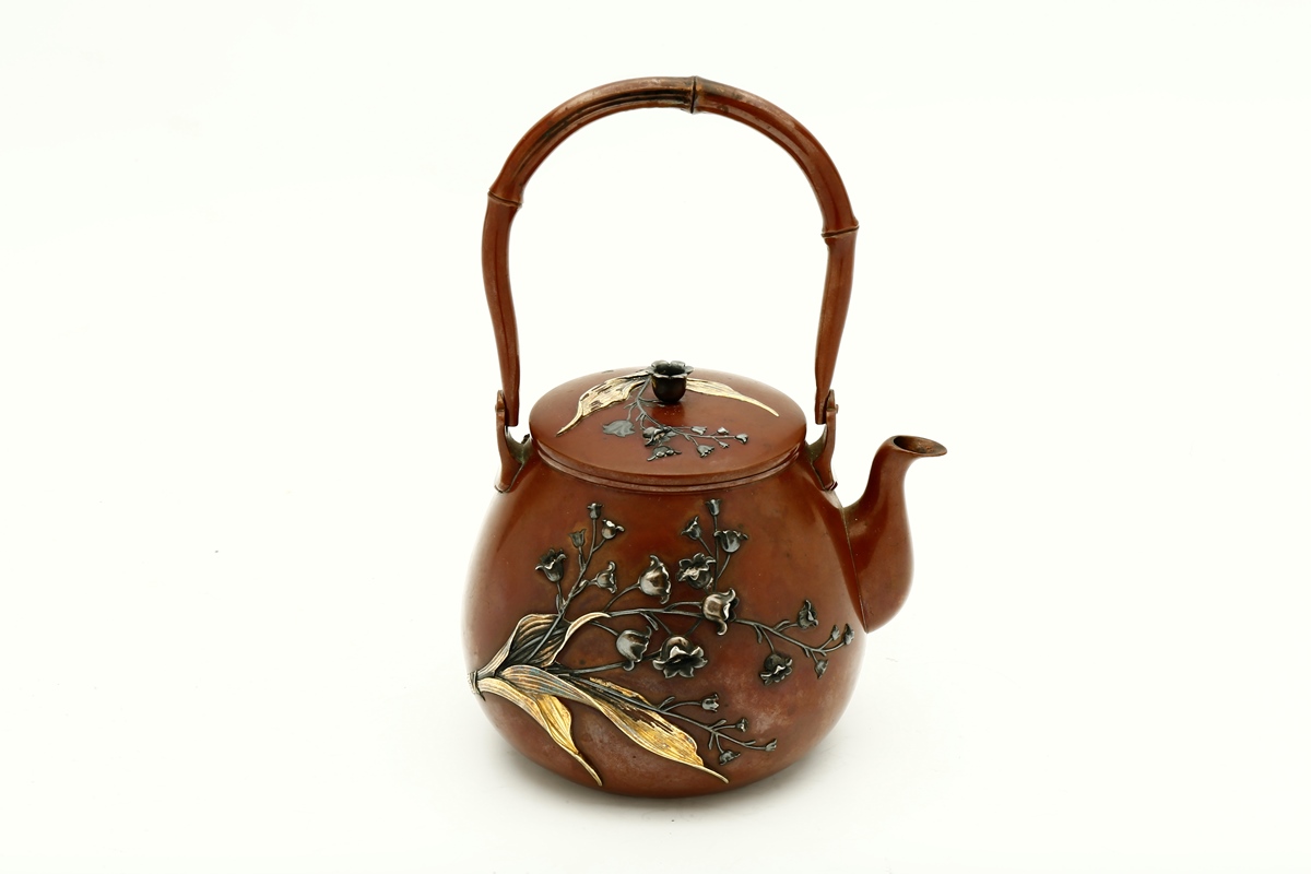 此器壺身及壺蓋均立體雕塑鎏金菖蒲,其枝葉仰俯自如, 出枝延至壺蓋,使紋飾構圖更顯生趣盎然;吐露飽滿的銀花苞象徵繁盛昌榮,呈現極緻工藝。配以盛放的花苞摘紐、竹節樣銅高身提把,令整器造型顯得修長雅致,別具氣韻。