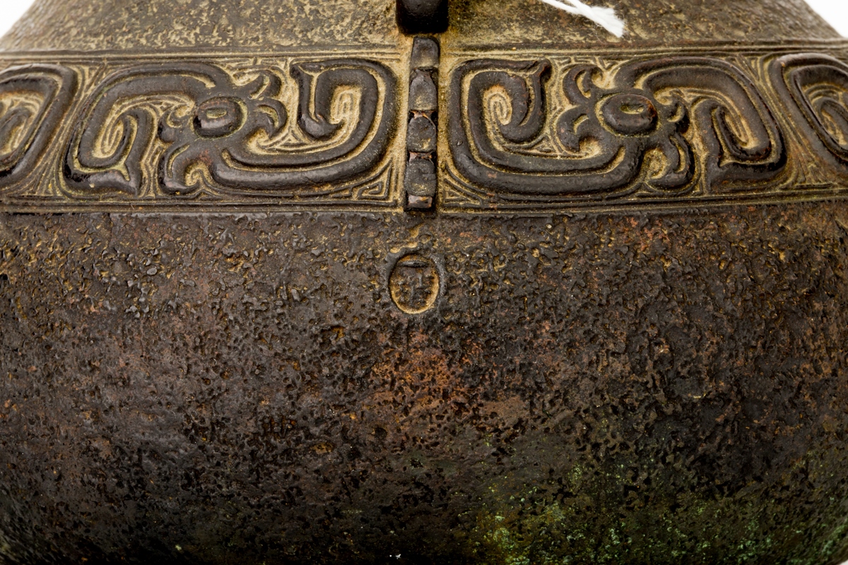 此藏品造工精湛繁複,由初代藏六的門下弟子西垣一瑳製,其傳世作品稀少,彌足珍貴。藏品表面為荒地紋肌理, 承襲藏六青銅器獸口壺的風格,揉合巧思及精湛技藝, 壺肩及壺蓋皆凸雕有寓意祥瑞的變形忍冬紋及饕餮紋,配佩環圈摘;壺身的瑞獸立體感強,雙目靈動,不怒而威。流嘴作獸口狀,角紋生動,神情昂然;銅把手造型為一雙仰嘯相對的出海龍頭,龍頭吐海水相連巧成提梁,整體寓意祥龍出海,高升昌隆,可見匠心。