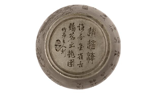 此罐直口短頸,圓鼓腹而腹下略收;一面運刀如筆,刻上明代詩人楊基寫的《立夏前一日有賦》:「漸老綠陰天,無家怯杜鵑。東風有今夜,芳草又明年。蠶熟新絲後,茶香煮酒前。都將南浦恨,聊寄北窗眠。」。茶罐另一面刻挫以山水家屋圖,遠近山巒,兀立隱現;樹幹參天挺拔枝葉繁茂,雕工精美,一派閑淡雅致之景象,是收藏珍品。器底化用蘇東玻《怡然以垂雲新茶見餉,報以大龍團,仍戲作小詩》內詩句;共箱,箱面題「沈存周 茶壺」及「楊基之詩」。