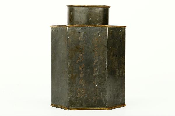 沈存周刻 錫六角詩文茶罐