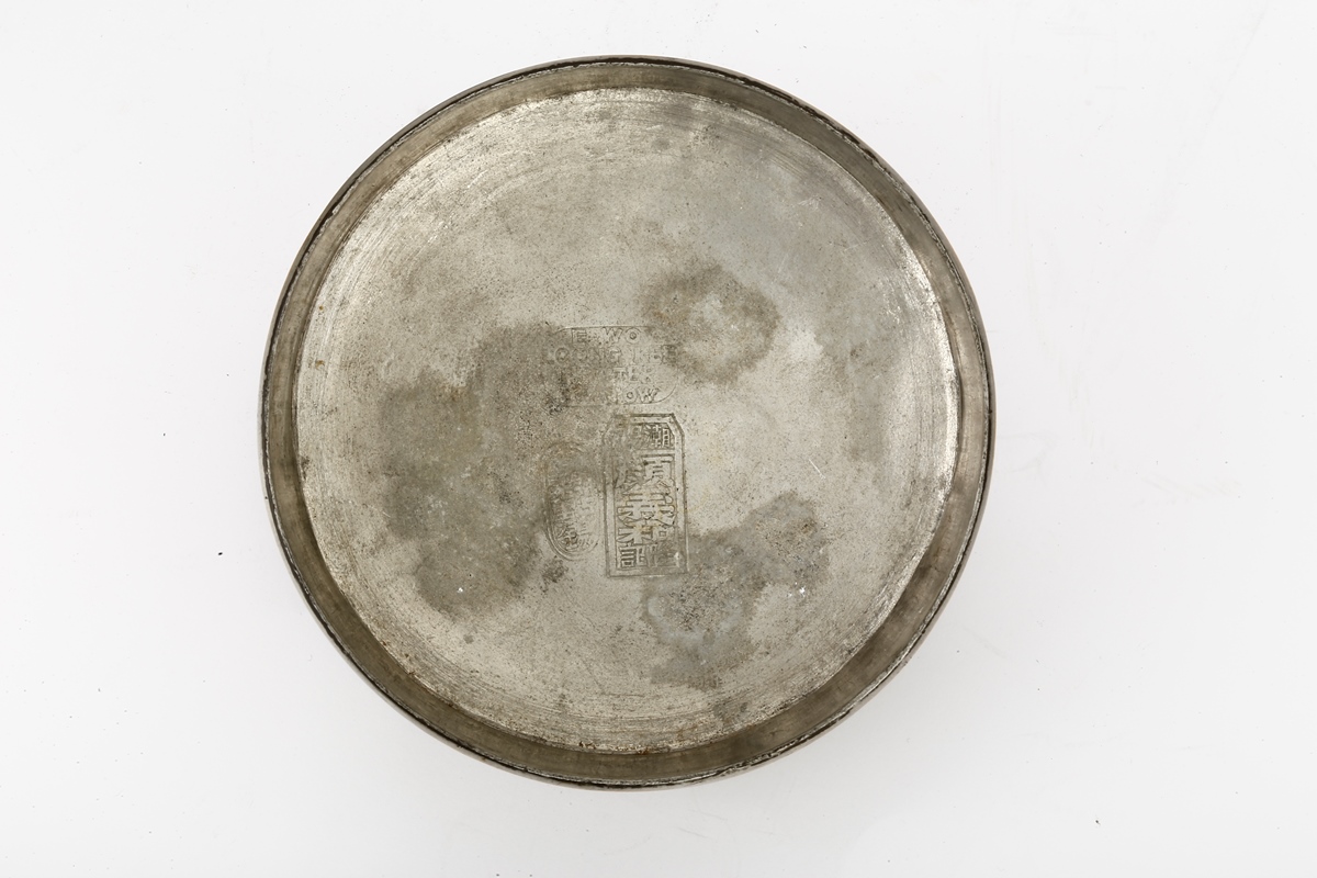 罐底及罐蓋內刻有「義和隆記」,鑄刻英文字樣「E WO LOONG KEE」與「PEWTER」和「SWATOW」分別代表錫器及點銅之意。共箱。