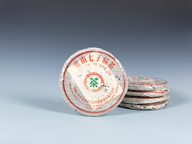 一組五片的首批7572製於八十年代前後,是小口中版本,為尖出內飛及長撇雲,包裝紙完整,見內票;加上倉儲良好,極為難得罕見。它是由香港利安茶行向雲南省茶司訂購,勐海茶廠製作,是絕無僅有的一批7572普洱青餅,彌足珍貴;其後的7572皆為熟茶。
